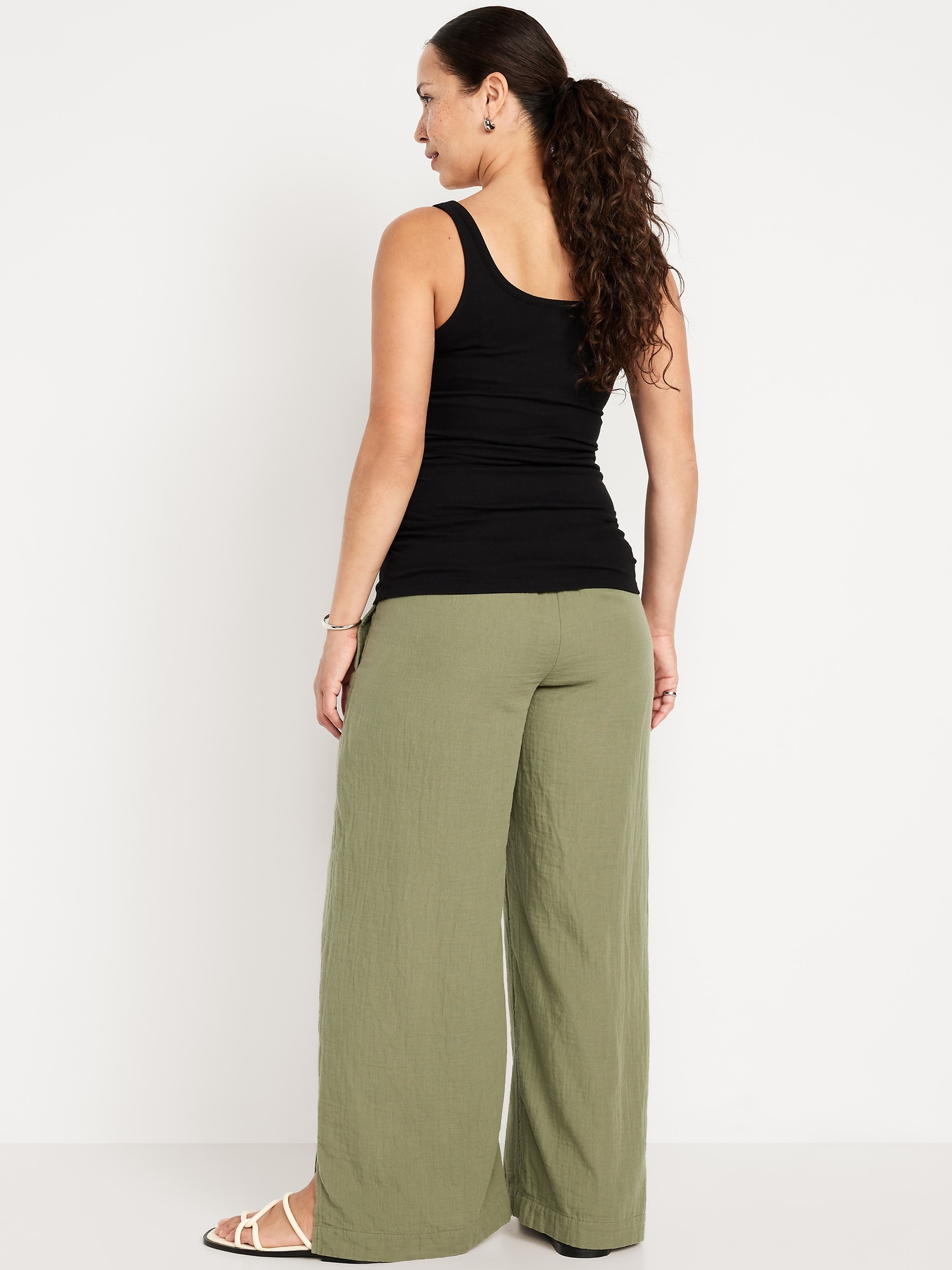 Maternity Rollover Waist Crinkle Gauze Wide-Leg Pants: A light, rippled fabric that’s begging to be beachside.rollover waist, pull-on style, on-seam hip pockets, wide leg, #771711