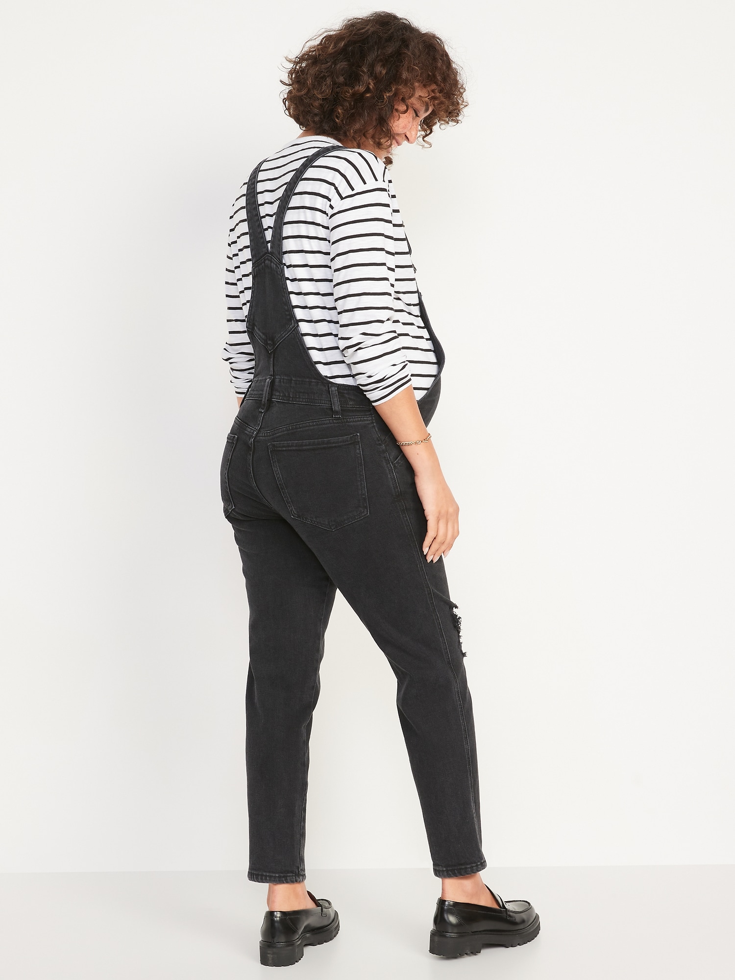 Maternity Side-Panel OG Straight Jean Overalls: Our OG Straight Jean Overalls? Think “mom jeans”…if your mom was a supermodel. Part ‘90s nostalgia, part new-normal comfort, served straight up 😎, Adjustable shoulder straps and metal button fastenings; Patch pocket at bib yoke., Banded waist, with built-in belt loops and discreet elastic side panels at the hips., Faux fly, with fading and whiskering to create a vintage, lived-in look., Soft, durable medium-wash cotton denim, with comfortable stretch., Never-Quit Shape Retention holds its shape and hugs in all the right places, wear after wear., These overalls are made with 5% recycled cotton. Less waste in the world 🌎, #759165