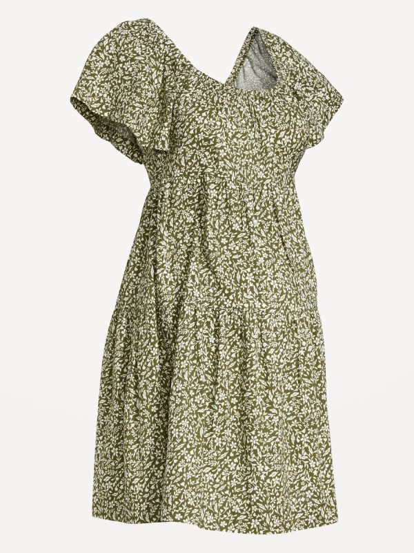 Maternity Square-Neck Mini Dress: square neck, short flutter sleeves, tiered shirred seams, all-over floral print, #826484