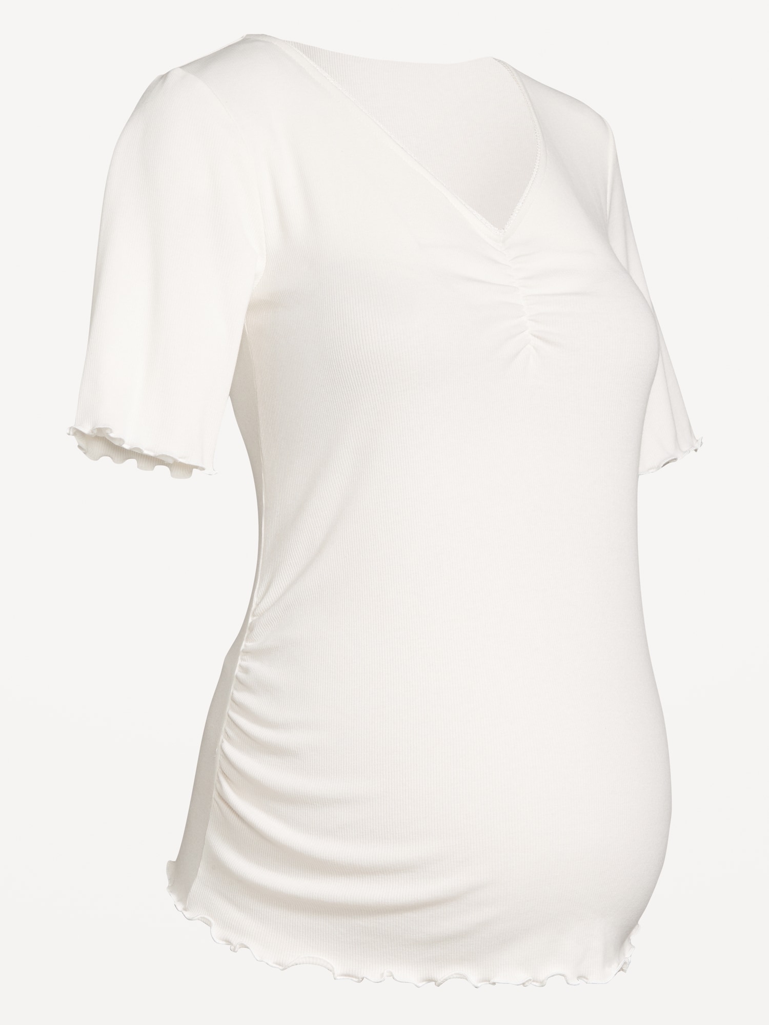 Maternity V-Neck Elbow-Sleeve Top: v-neck, elbow-length sleeves, shirred sides for a flexible fit, lettuce-edge trim, #826402