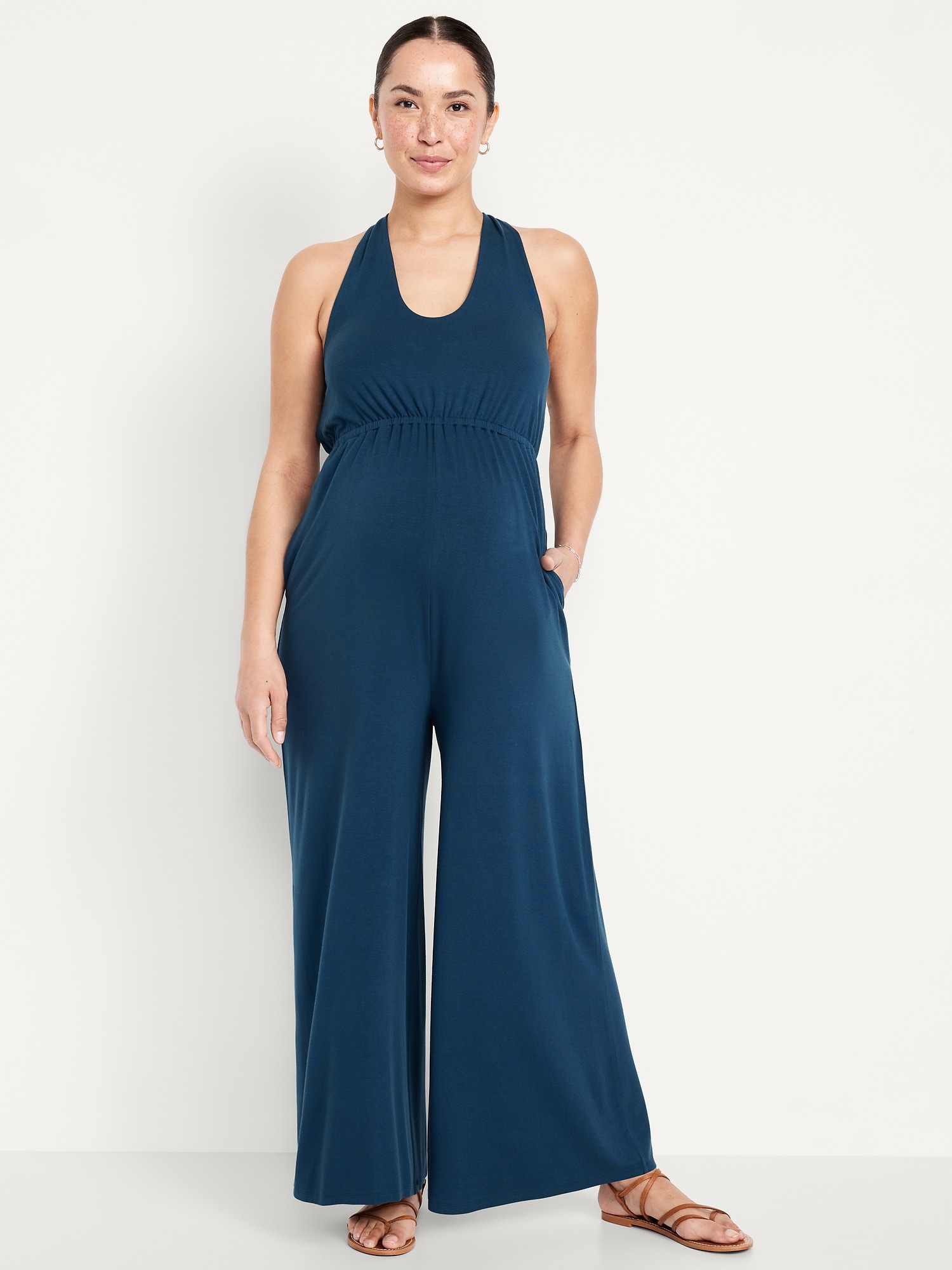 Maternity Waist-Defined Halter Jumpsuit: perfect for baby shower, tie-back halter neck, sleeveless, elastic waistband, on-seam pockets, wide leg, #719575