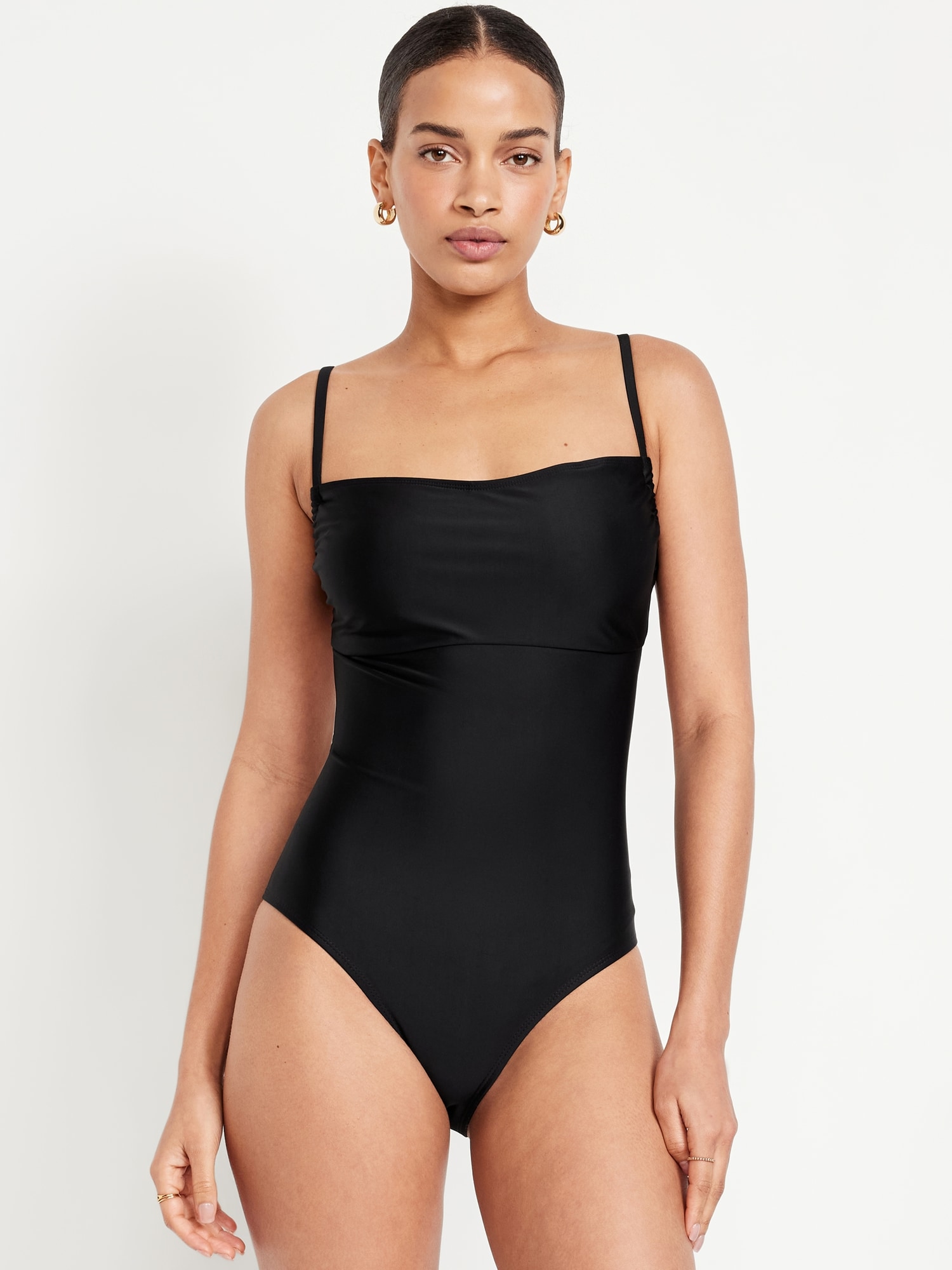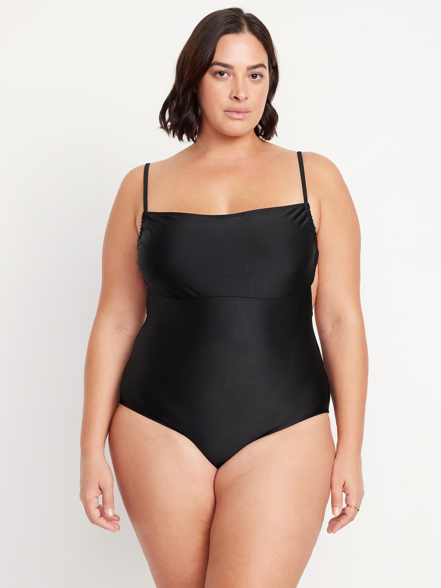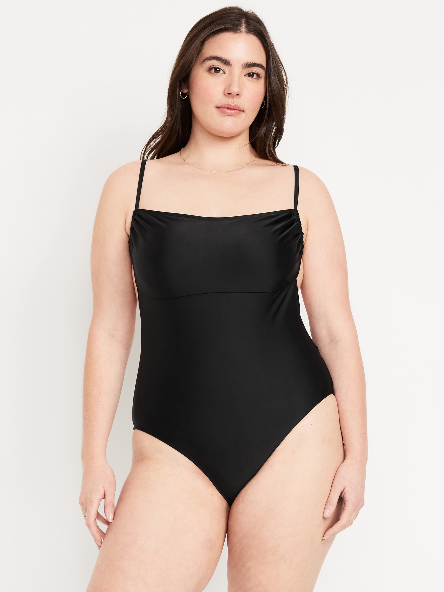 Matte Cutout Back One-Piece Swimsuit: spaghetti straps, ruched bodice, shelf bra, removable pads, cutout back, tie-back closure, elastic leg openings, #660611