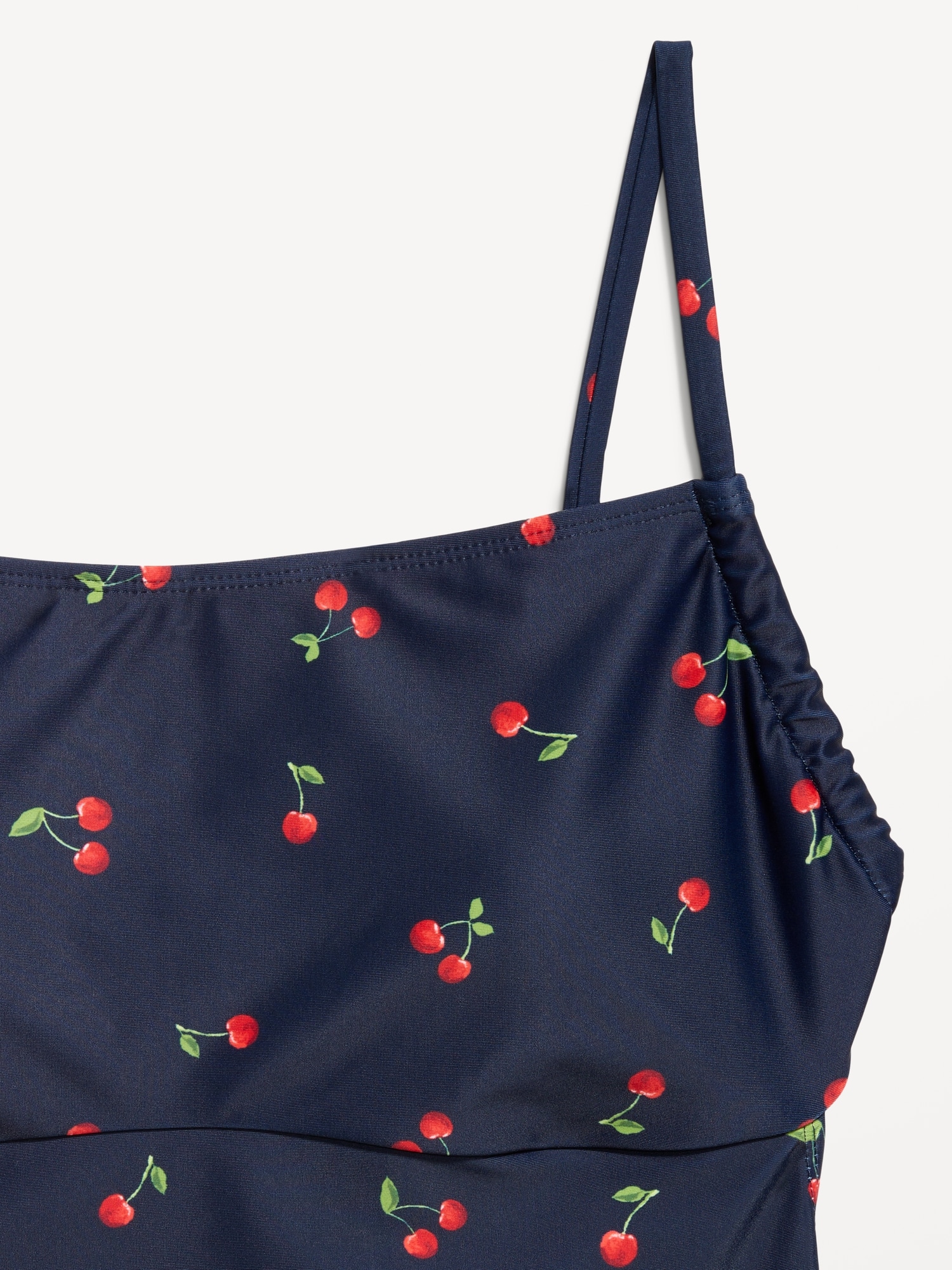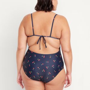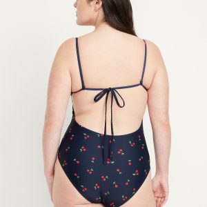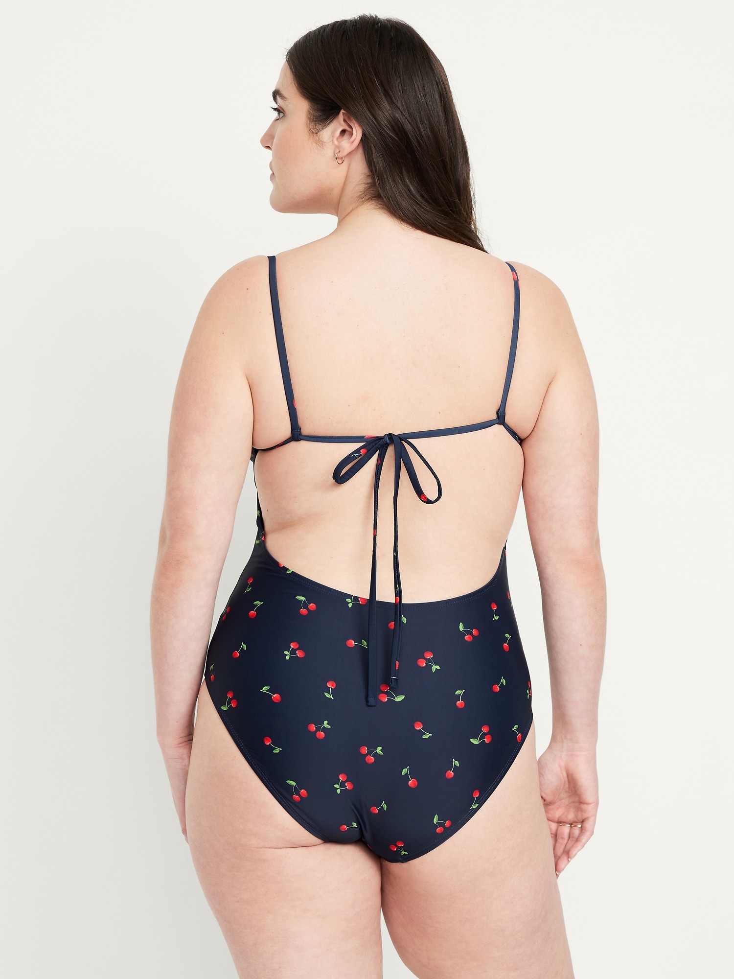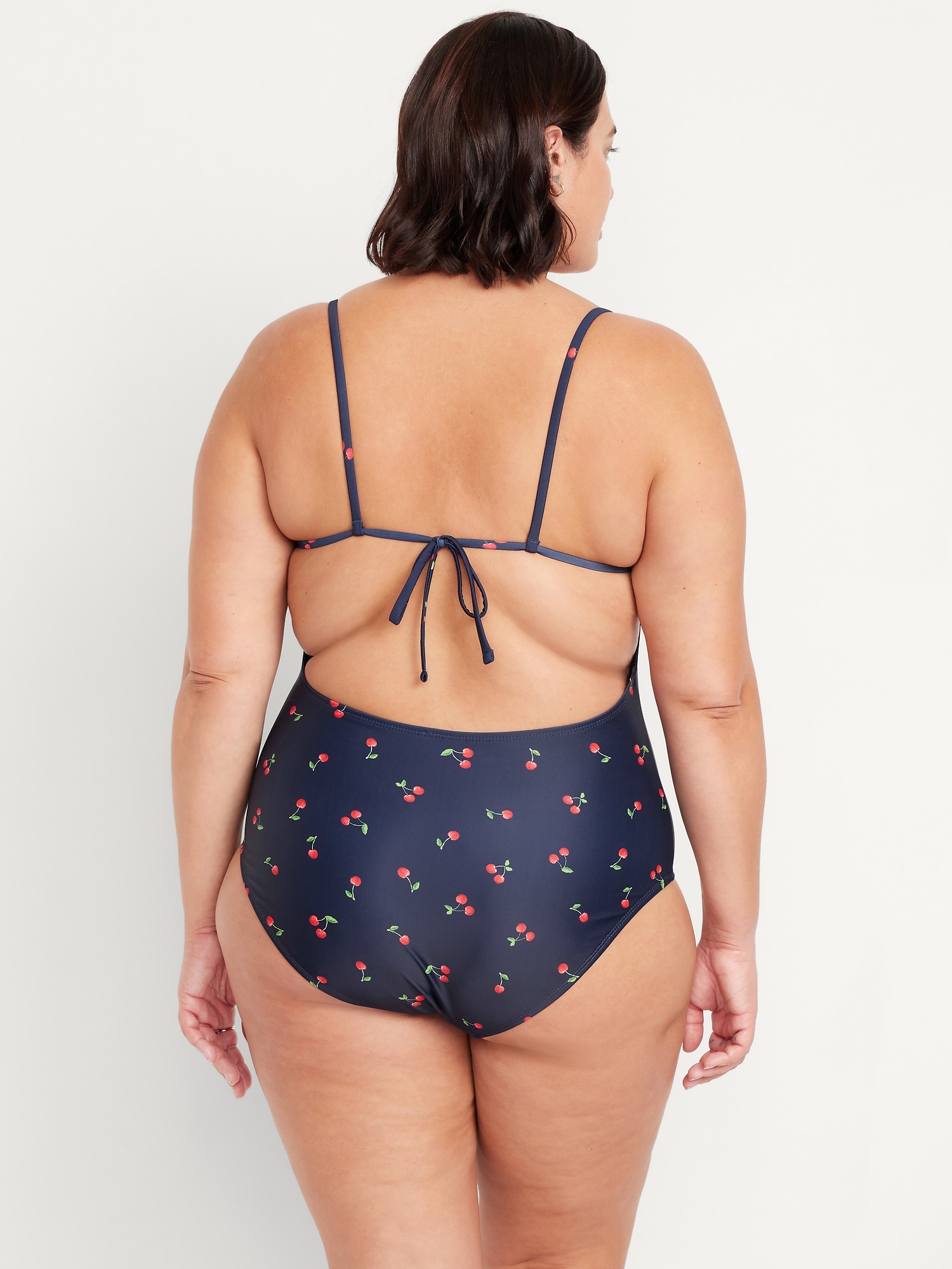 Matte Cutout Back One-Piece Swimsuit: spaghetti straps, ruched bodice, shelf bra, removable pads, cutout back, tie-back closure, elastic leg openings, #660611