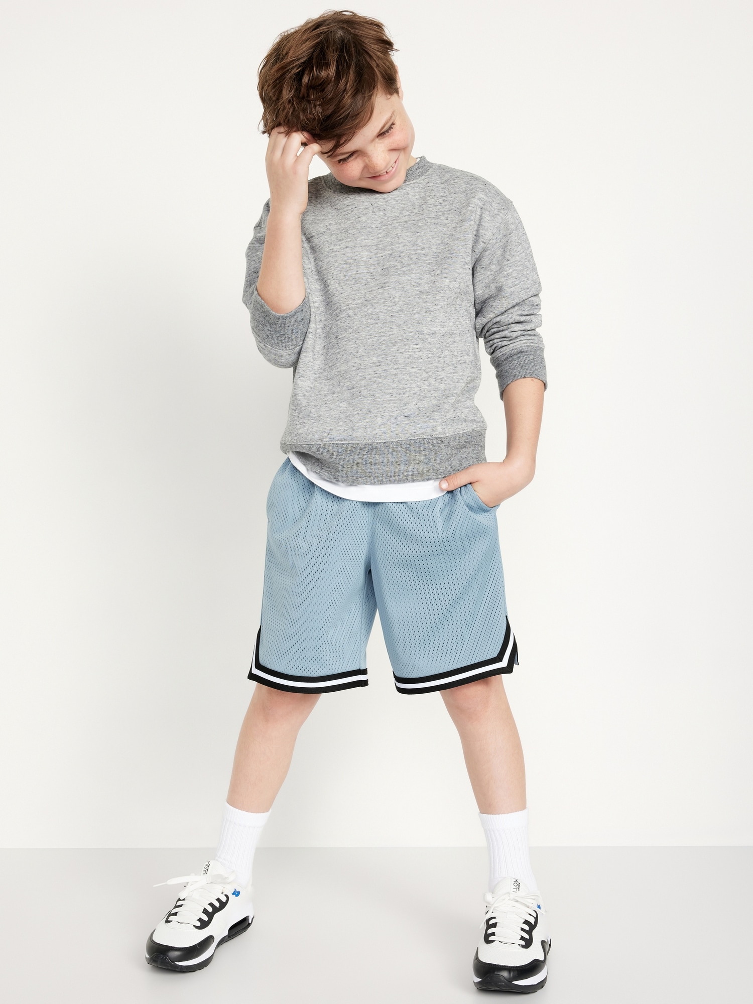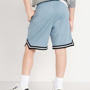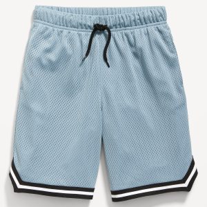 Mesh Basketball Shorts for Boys (At Knee): Made to keep up with all their shenanigans., Elasticized waistband, with adjustable drawstring., On-seam welt pockets., Retro striped tape trim at leg openings and vented sides., Breathable lightweight mesh lets him vent., Smooth, lightweight tricot lining., #875637