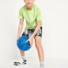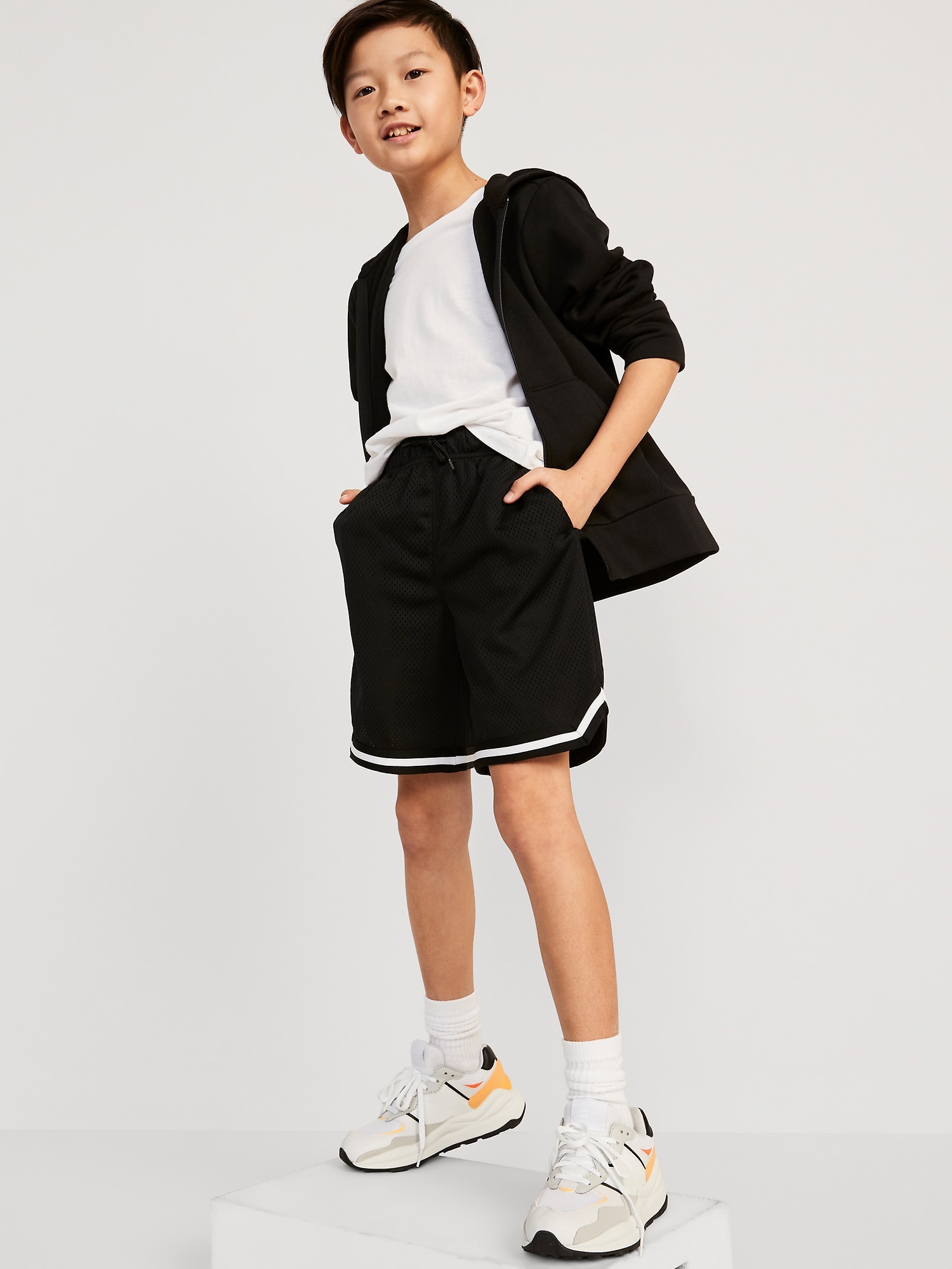 Mesh Basketball Shorts for Boys (At Knee): Made to keep up with all their shenanigans., Elasticized waistband, with adjustable drawstring., On-seam welt pockets., Retro striped tape trim at leg openings and vented sides., Breathable lightweight mesh lets him vent., Smooth, lightweight tricot lining., #875637
