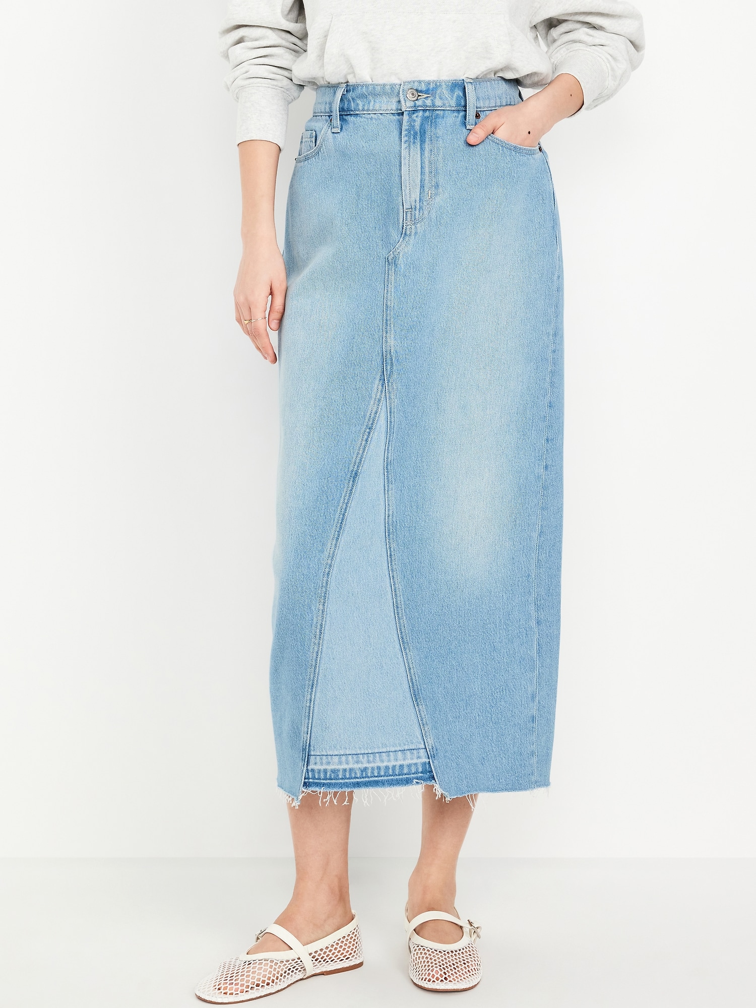 Mid-Rise Jean Maxi Skirt: zip fly, front scoop pockets, back patch pockets, front center slit, maxi length, #659674