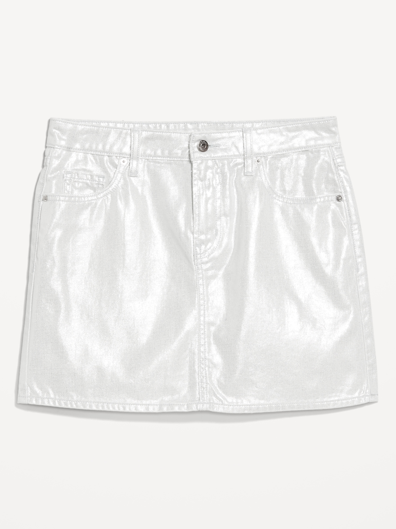 Mid-Rise OG Shine Mini Skirt: button front, belt loops, zip fly, front scoop pockets, back patch pockets, #582165