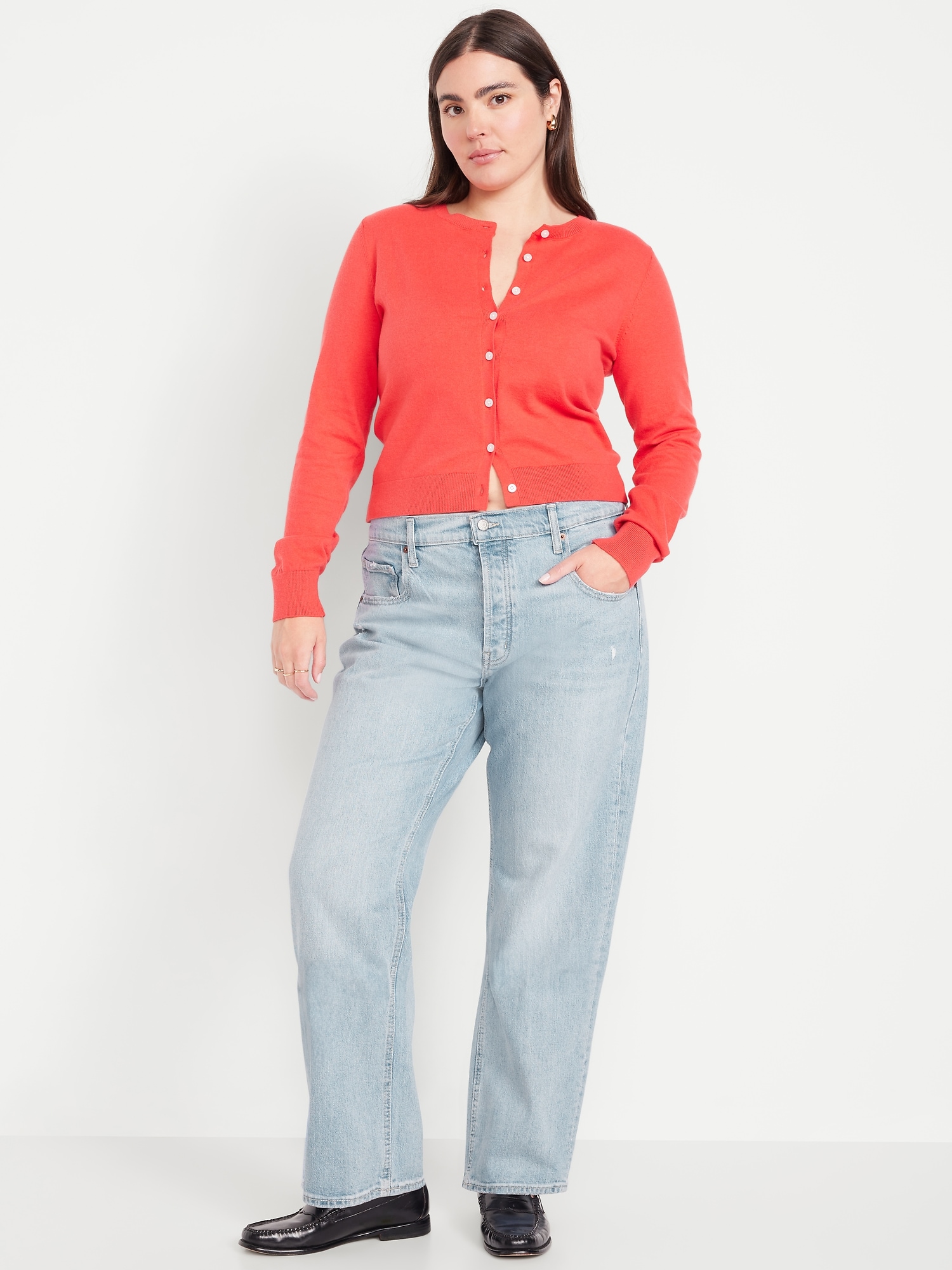 Mid-Rise Slouchy Straight Jeans: Low-slung and laid back, with puddling at the hem.mid-rise waist that’s low slung on the hips, hidden button fly, straight leg, #805756