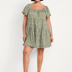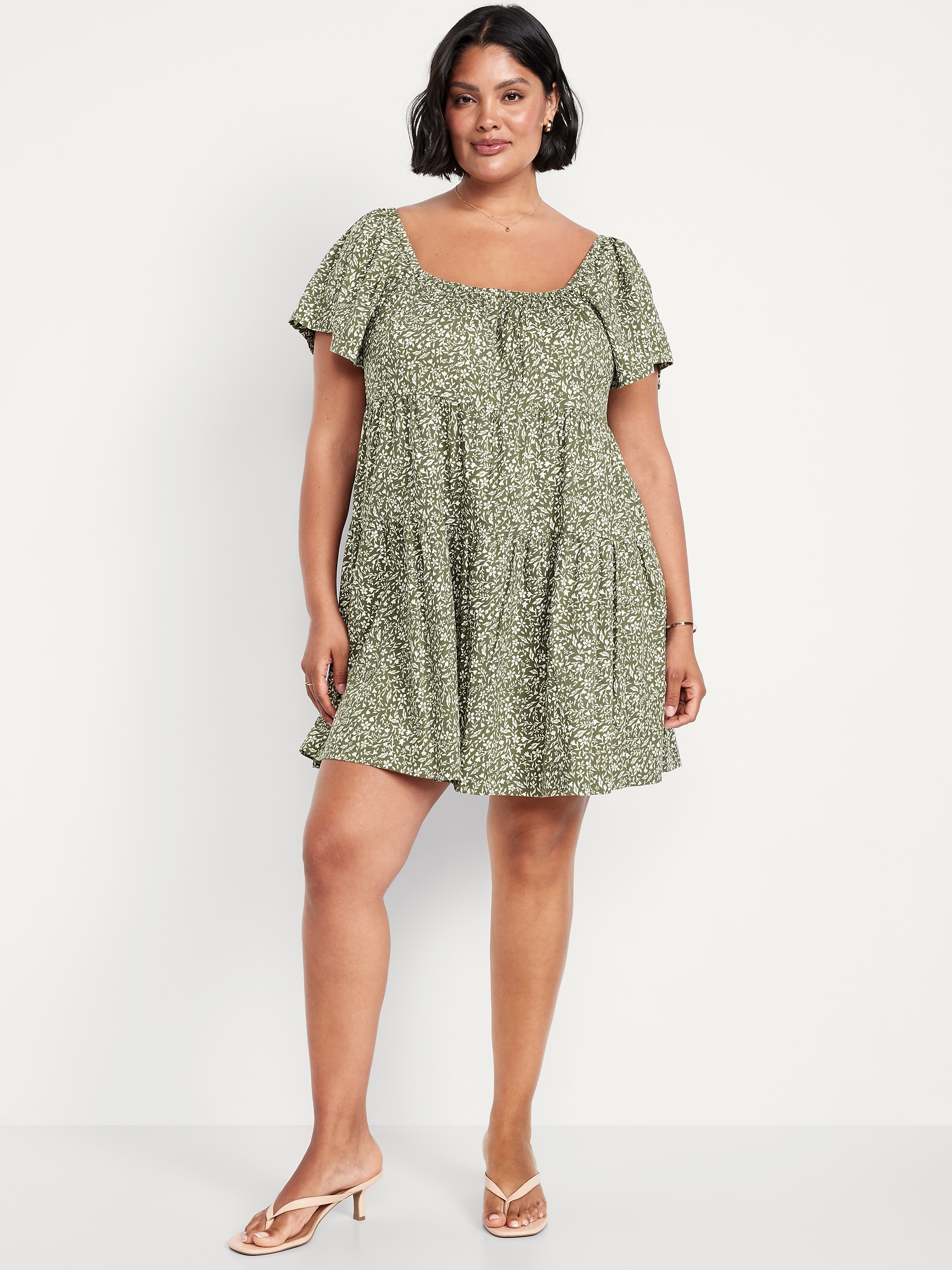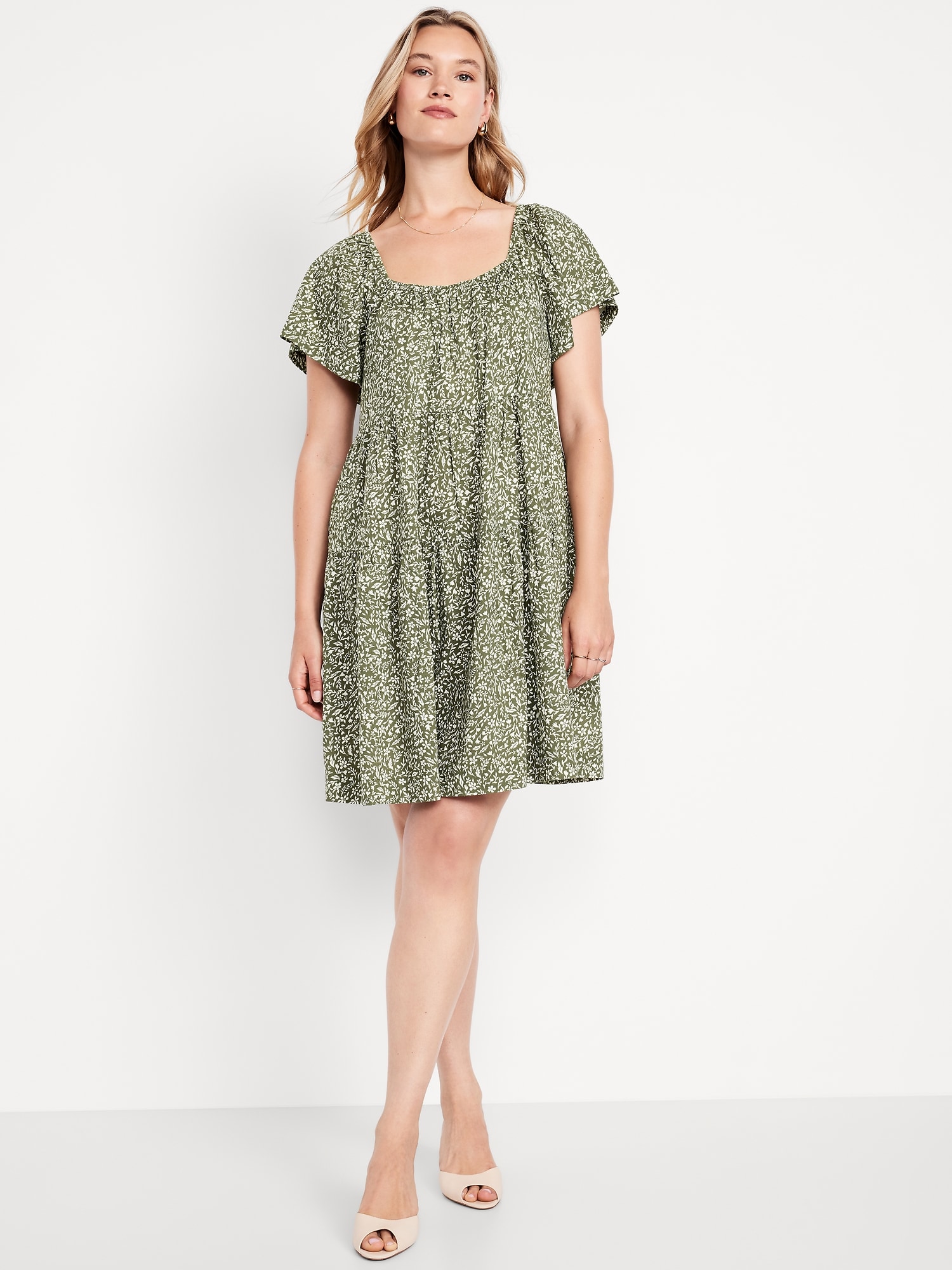 Mini Floral Swing Dress: square elastic neckline, flutter sleeves, tiered seams, shirred detail, #809629