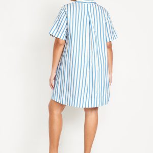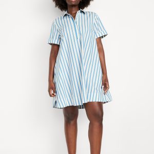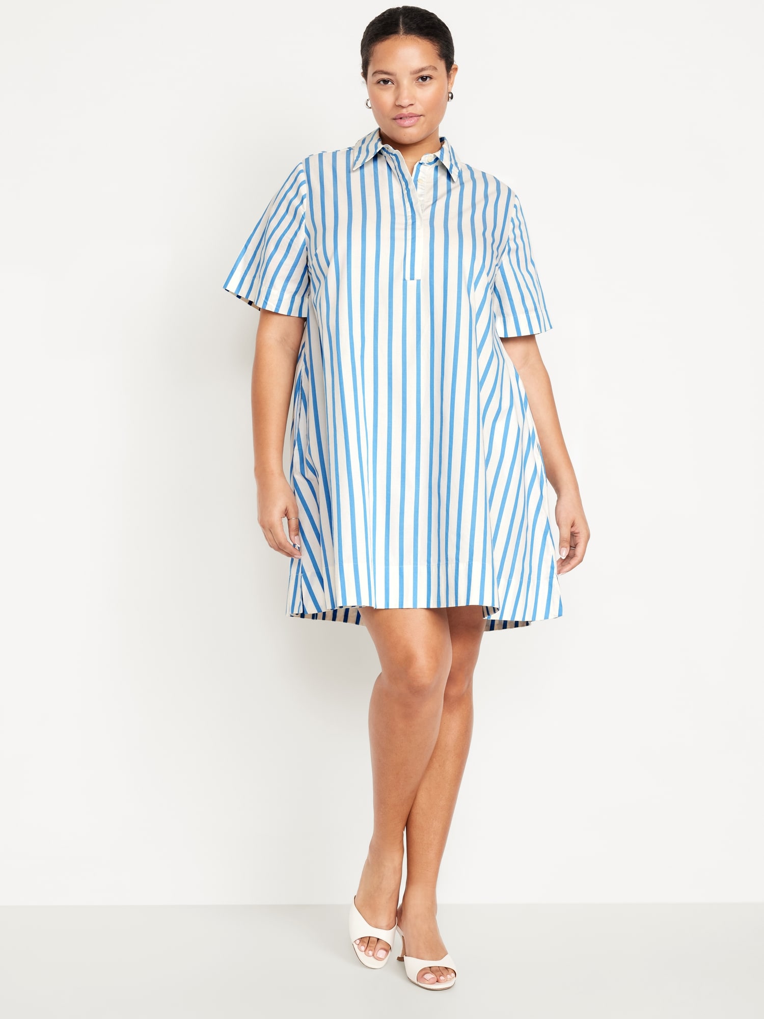 Mini Swing Shirt Dress: spread collar, elbow-length sleeves, covered button placket, vertical striped print, vented sides, #705705