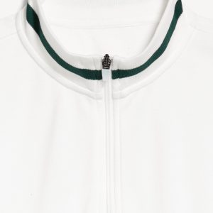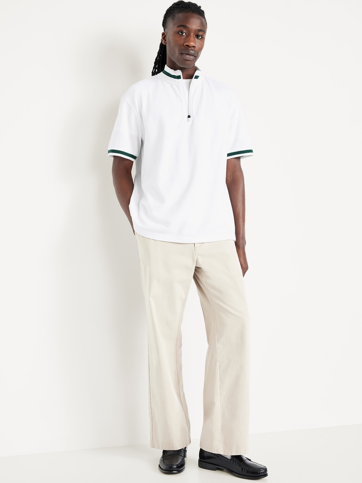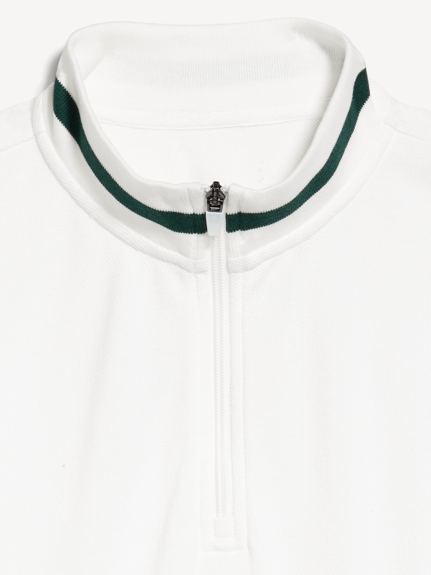 Mock-Neck Pique Quarter Zip: quarter-zip mock neck, short sleeves, contrasting stripes at neck and cuffs, #762331