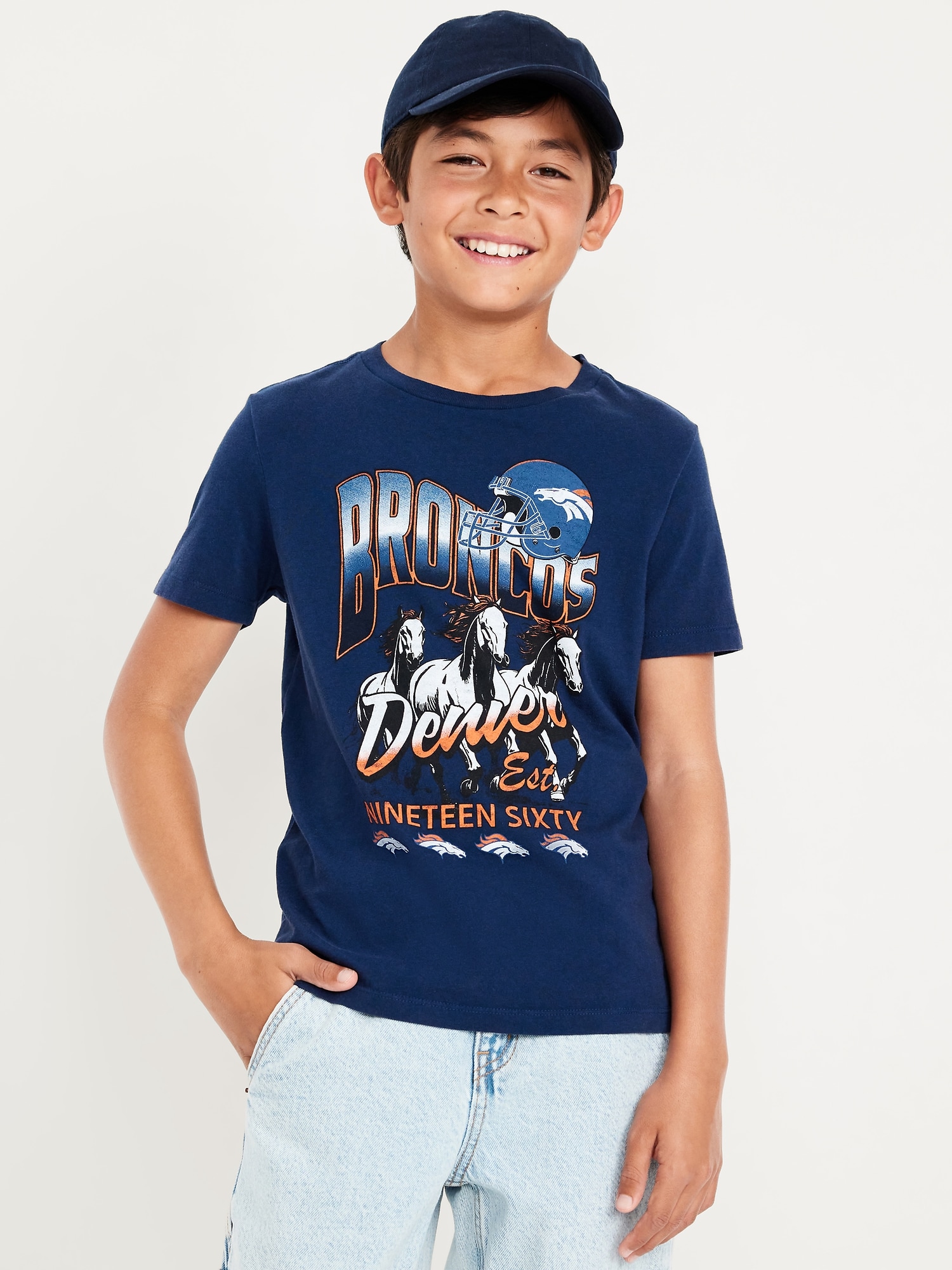 NFL™ Denver Broncos™ Gender-Neutral Graphic T-Shirt for Kids: crew neck, short sleeves, licensed graphic, ©2025 NFL Enterprises LLC. NFL and the NFL shield design are registered trademarks of the National Football League., #787985