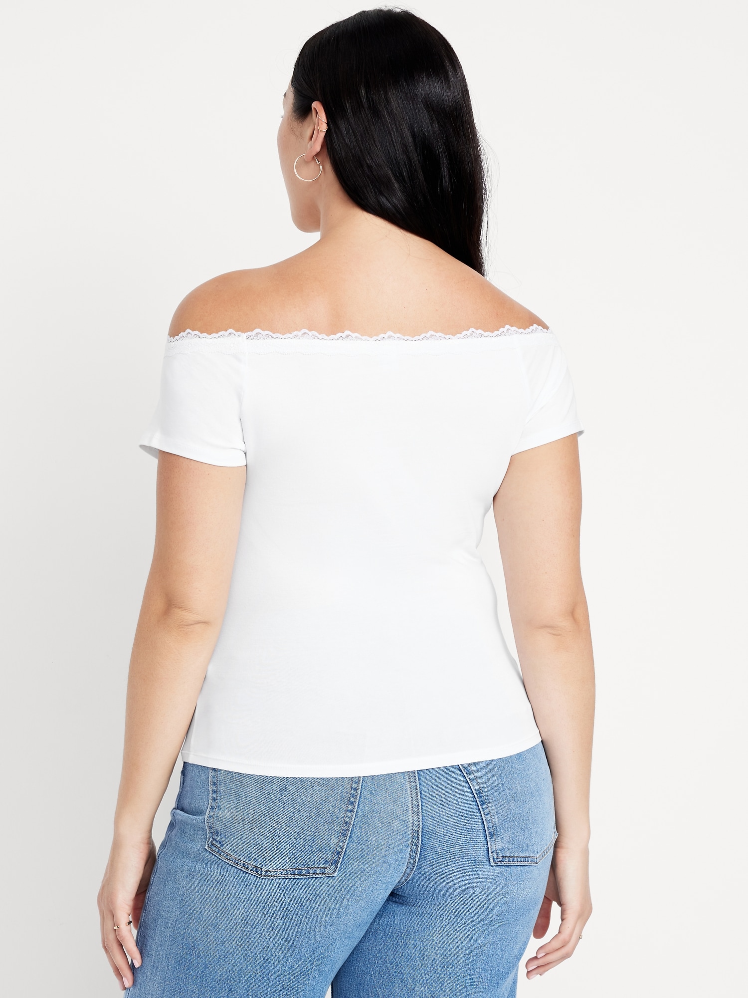 Off-Shoulder Lace-Trim Top: off-shoulder neckline, lace trim, short sleeves, #801545