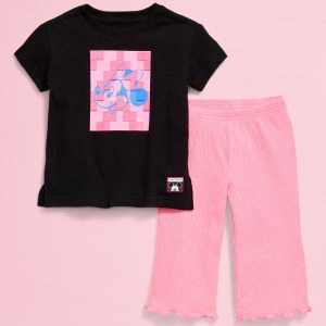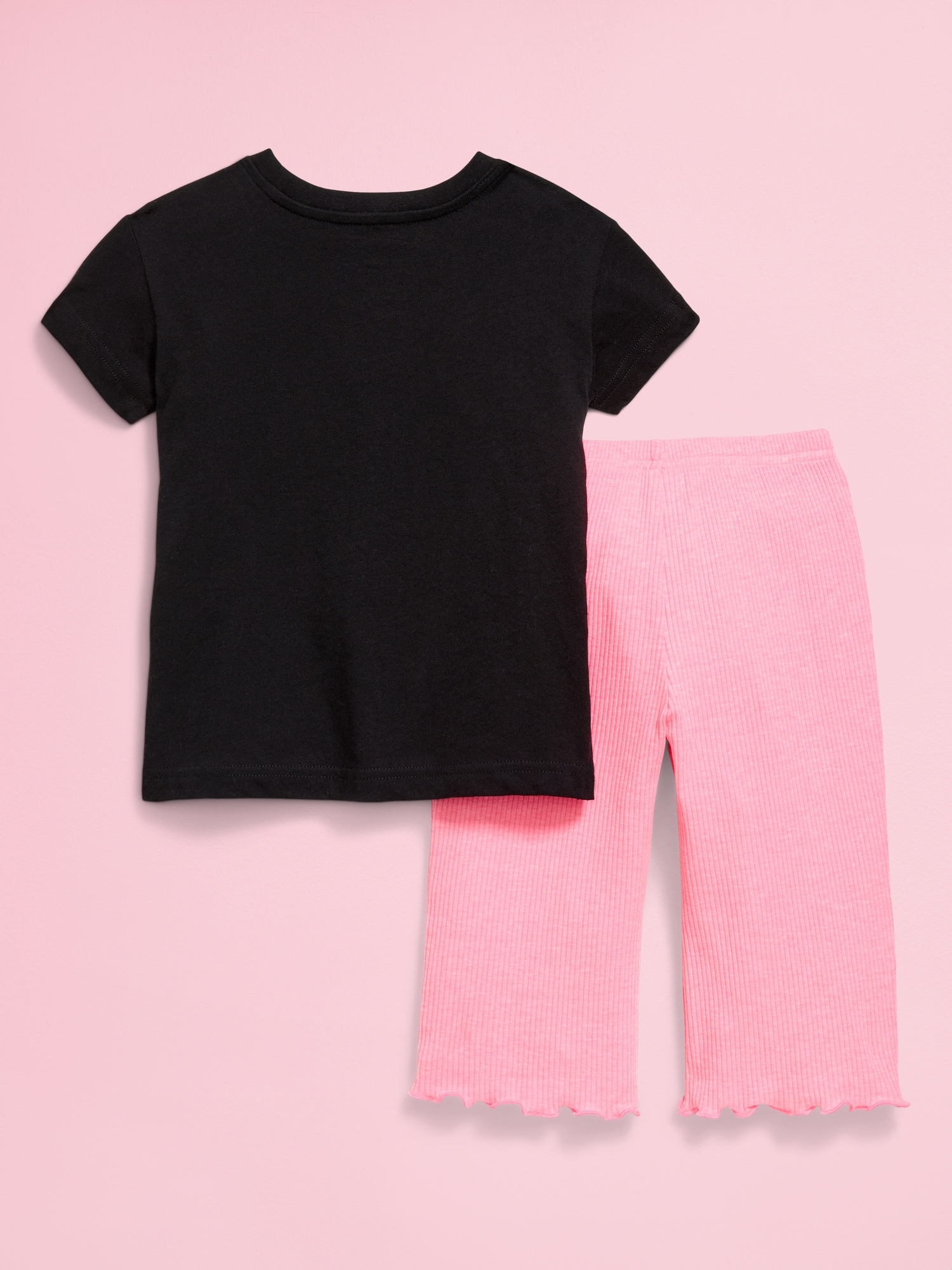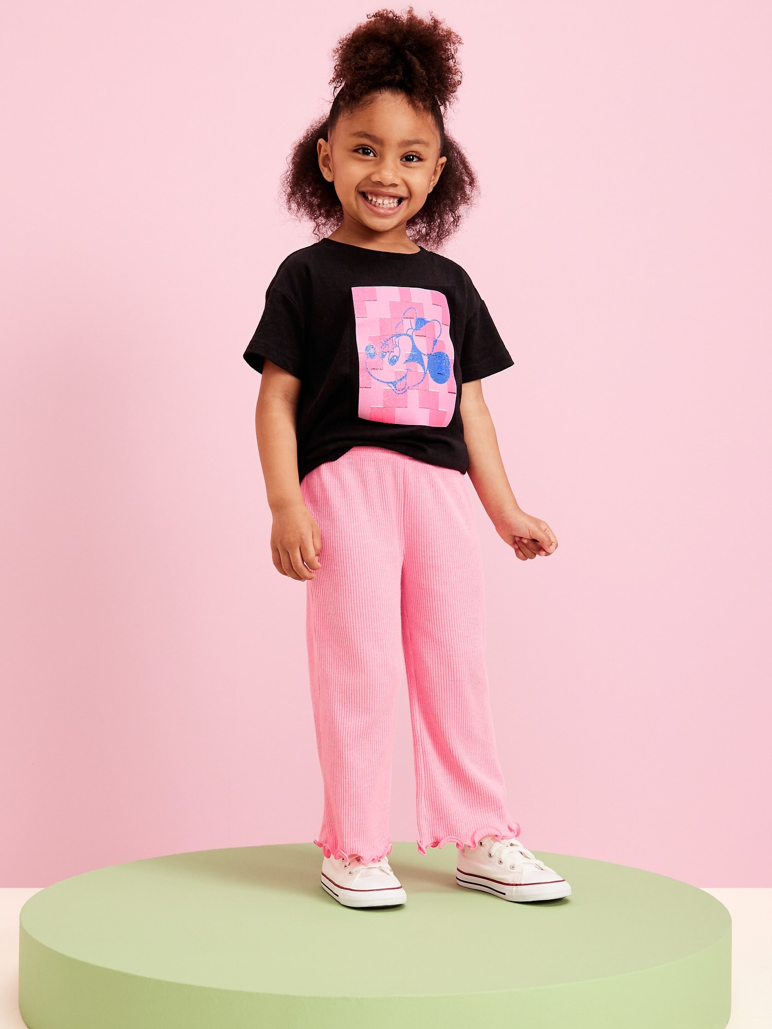 Old Navy x Disney© Minnie Mouse Tunic and Flare-Leg Pants Set for Toddler Girls: crew neck, short sleeves, drop shoulders, licensed graphic, hi-lo, side slits, coordinating pants, elasticized waistband, flare leg, lettuce edge leg cuffs, Disney©, #762119