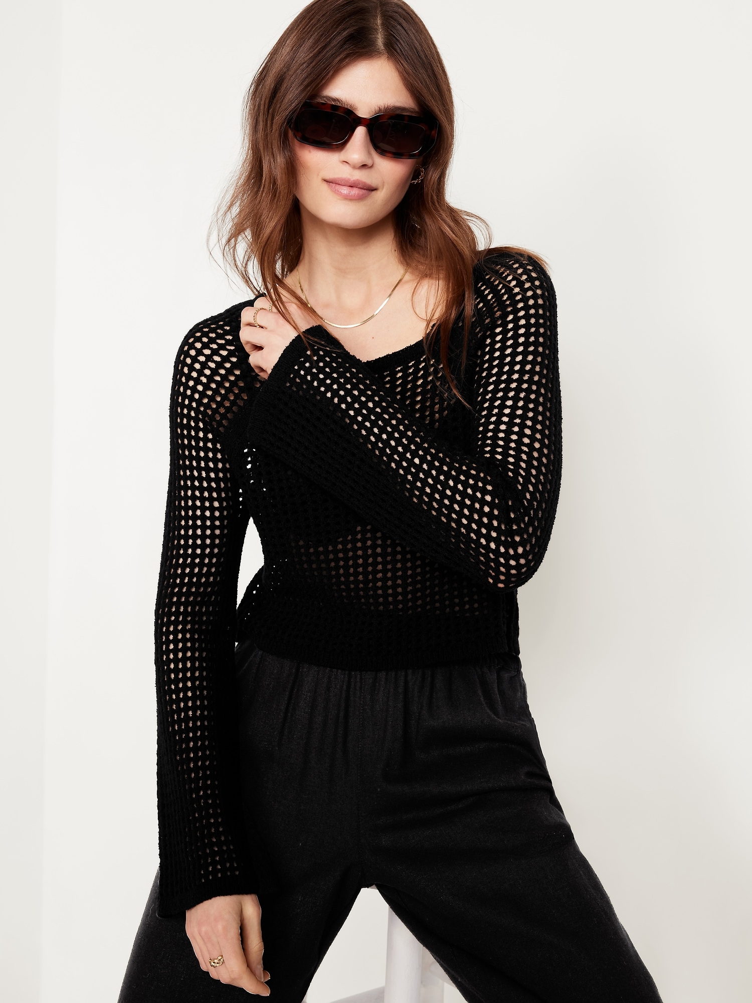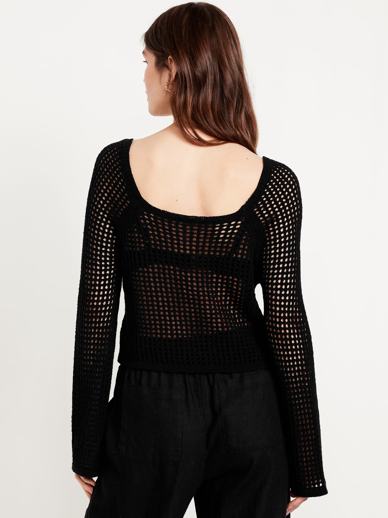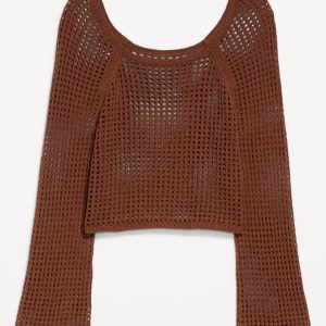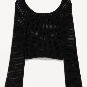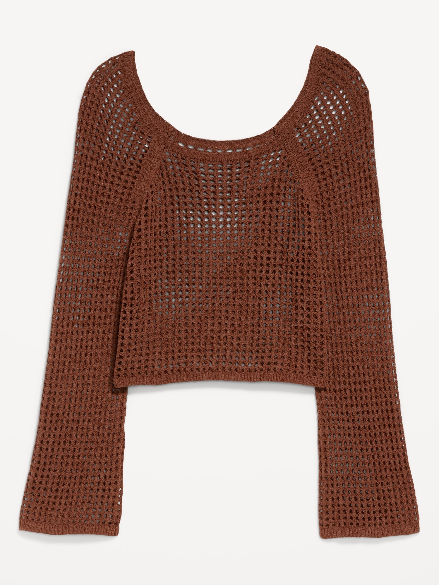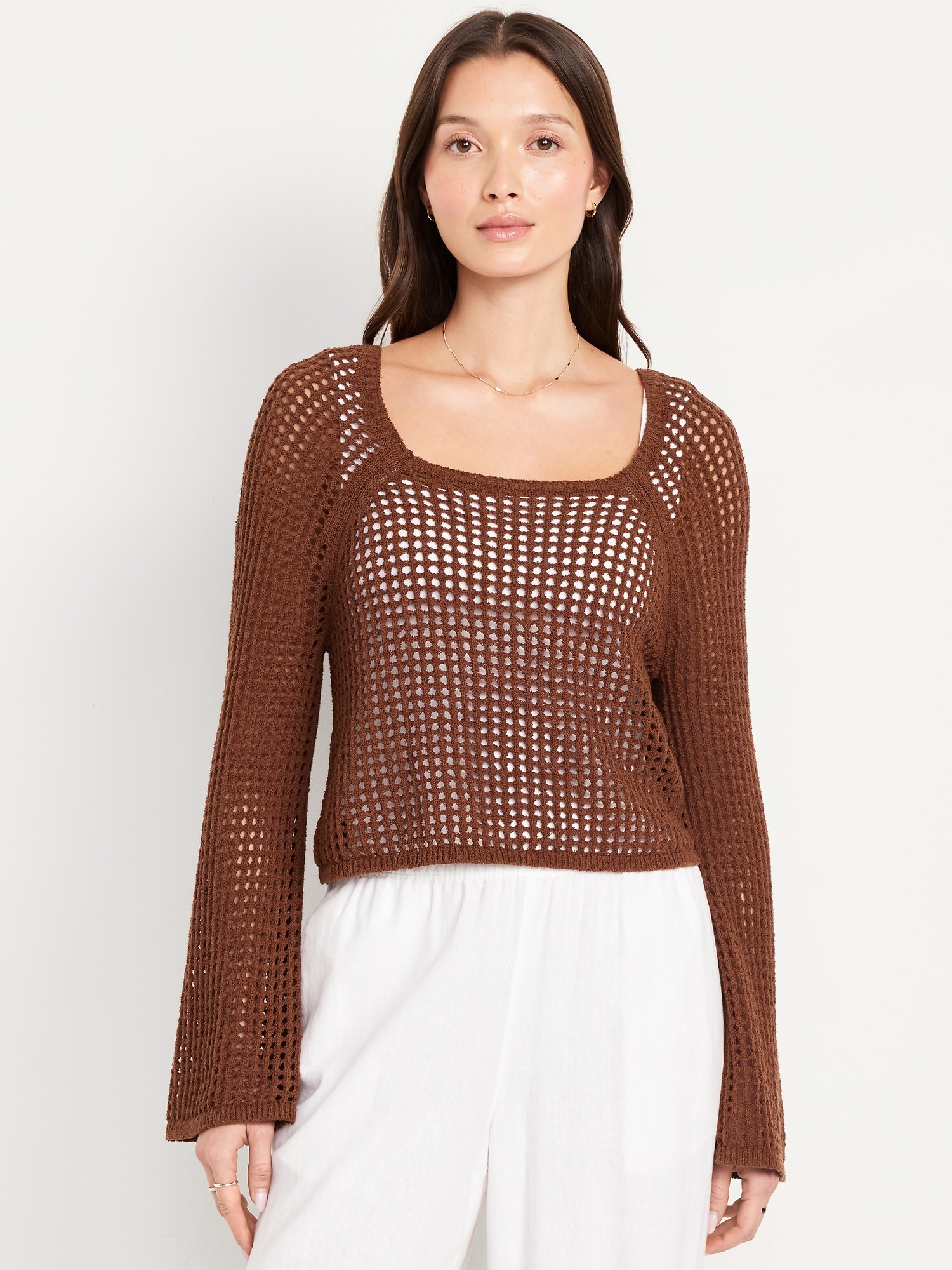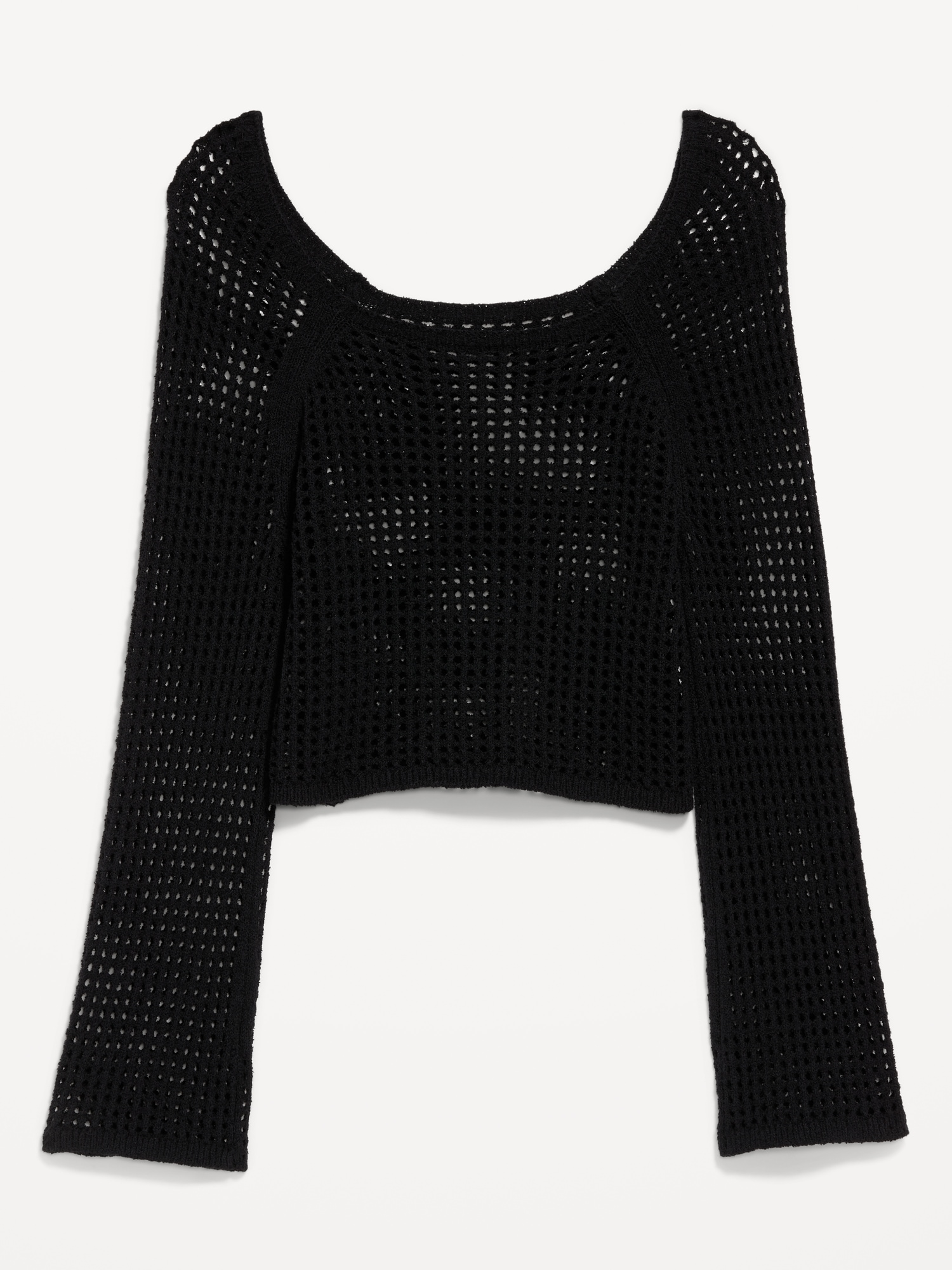 Open-Stitch Cropped Bouclé Sweater: square neck, long sleeves, great for layering, #664078