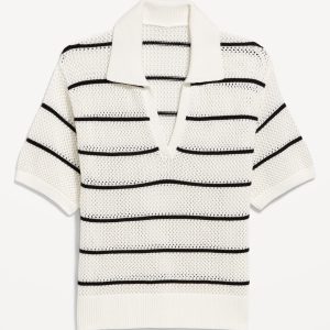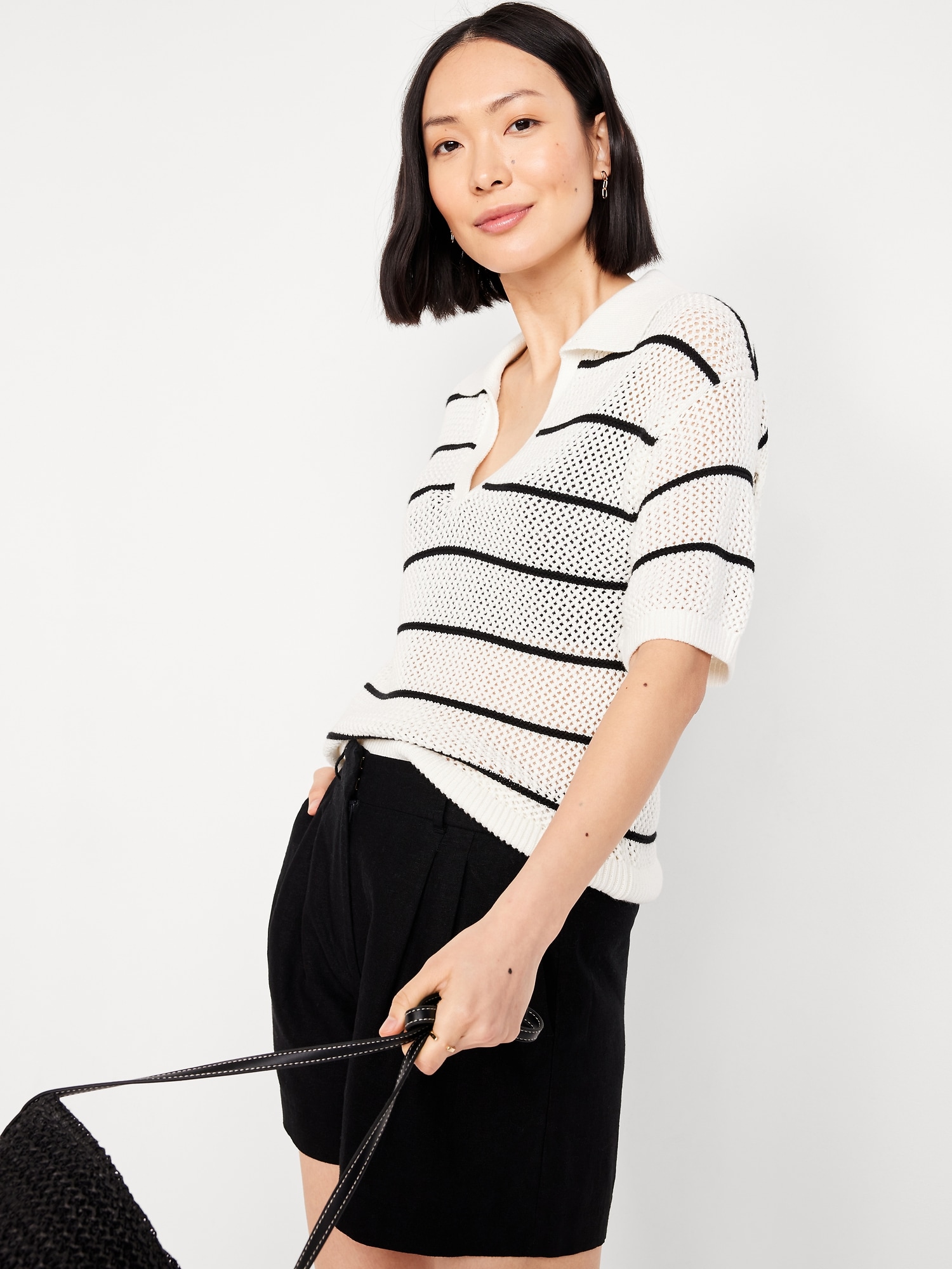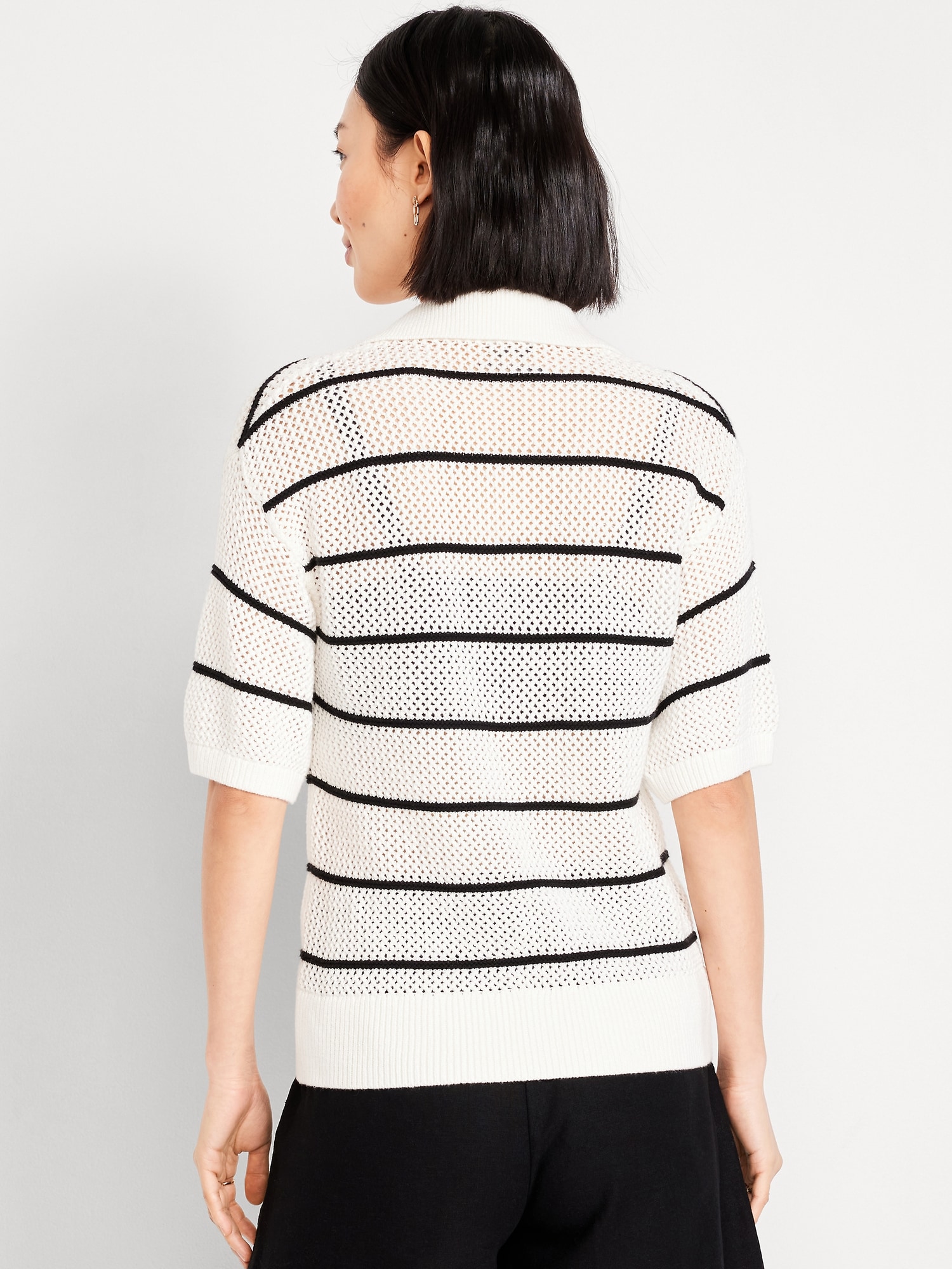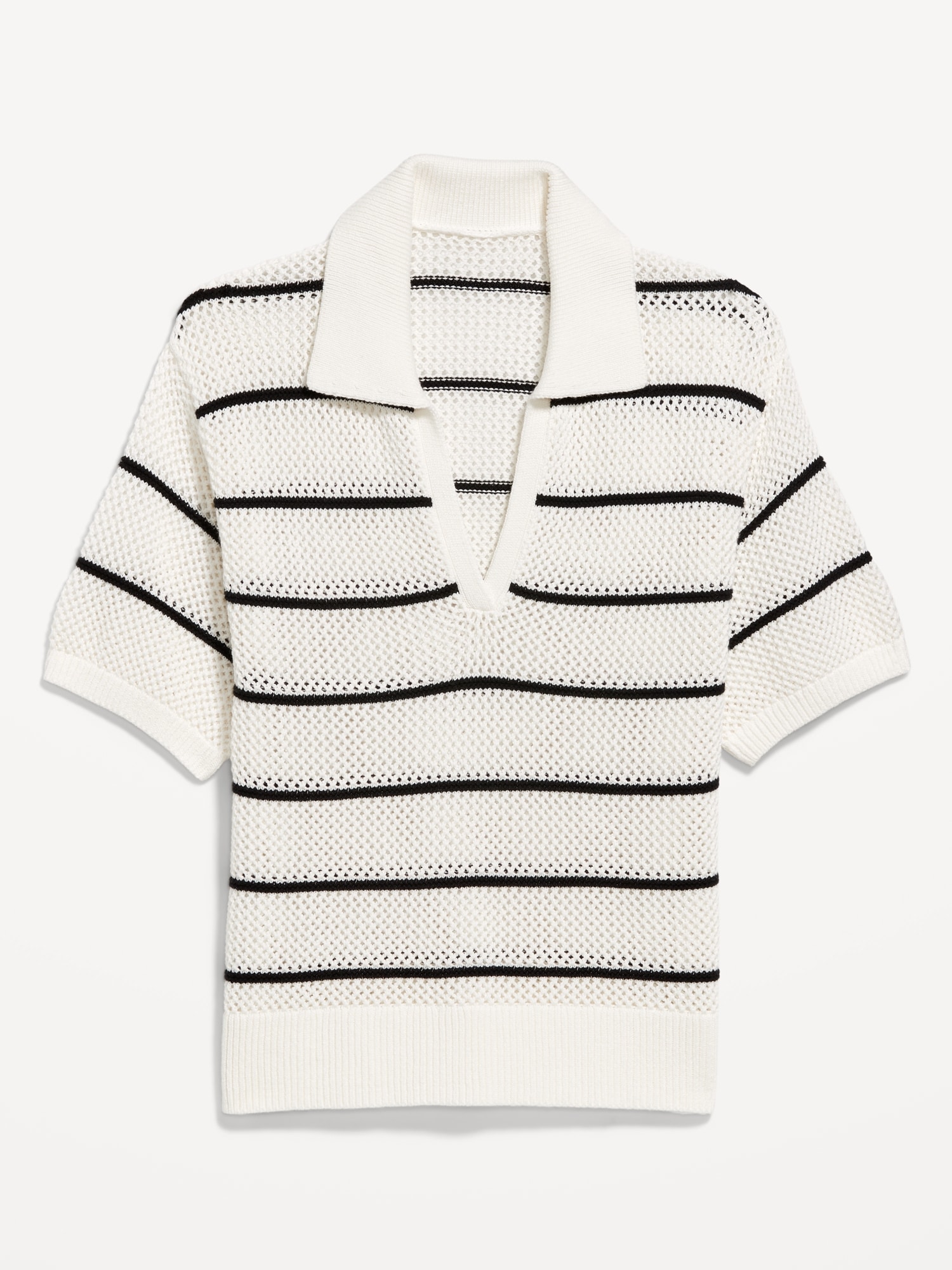 Open-Stitch Polo Sweater: spread v-neck collar, elbow-length sleeves, pullover style, #664105