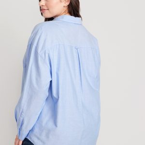 Oversized Button-Down Boyfriend Shirt: spread collar, long sleeves with buttoned cuffs, full-button front, patch chest pocket, curved hem, vertical stripes, #798437