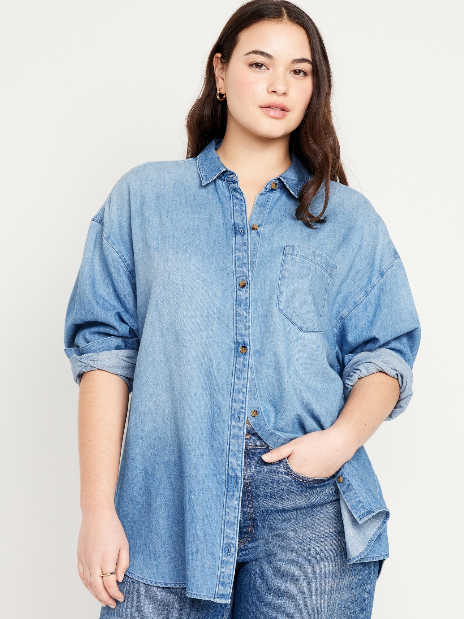Oversized Button-Down Boyfriend Shirt: spread collar, long sleeves with buttoned cuffs, full-button front, patch chest pocket, curved hem, vertical stripes, #798437