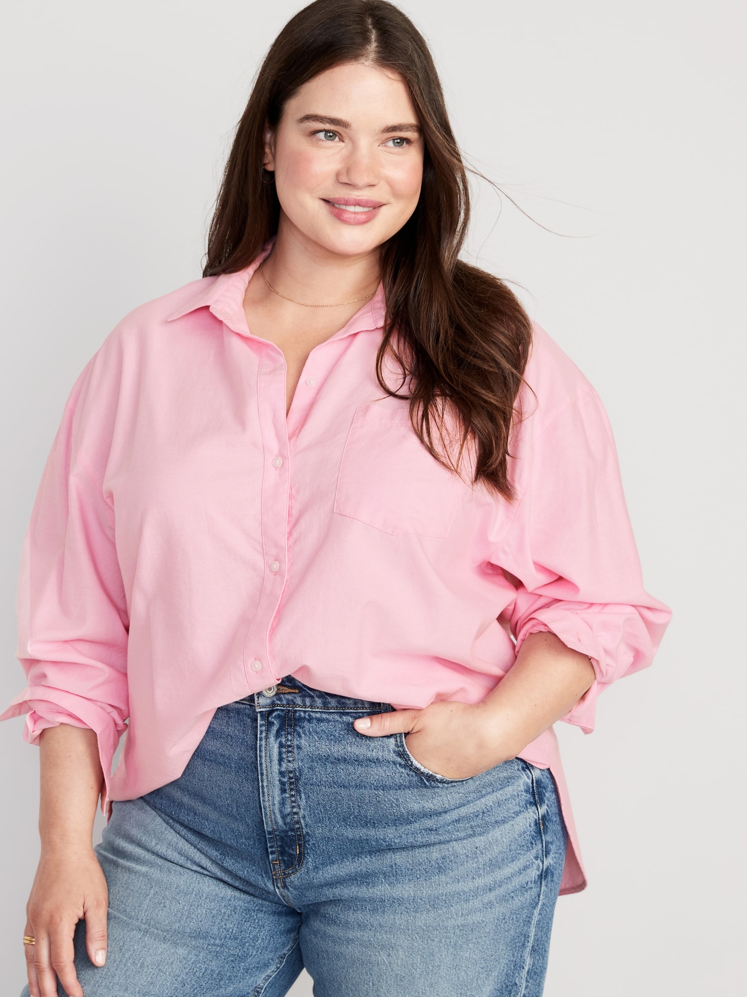 Oversized Button-Down Boyfriend Shirt: spread collar, long sleeves with buttoned cuffs, full-button front, patch chest pocket, curved hem, vertical stripes, #798437
