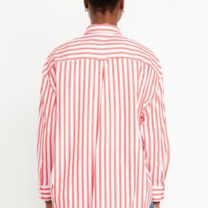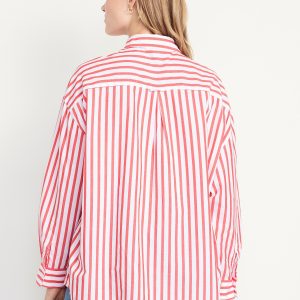 Oversized Button-Down Boyfriend Shirt: spread collar, long sleeves with buttoned cuffs, full-button front, patch chest pocket, curved hem, vertical stripes, #798437