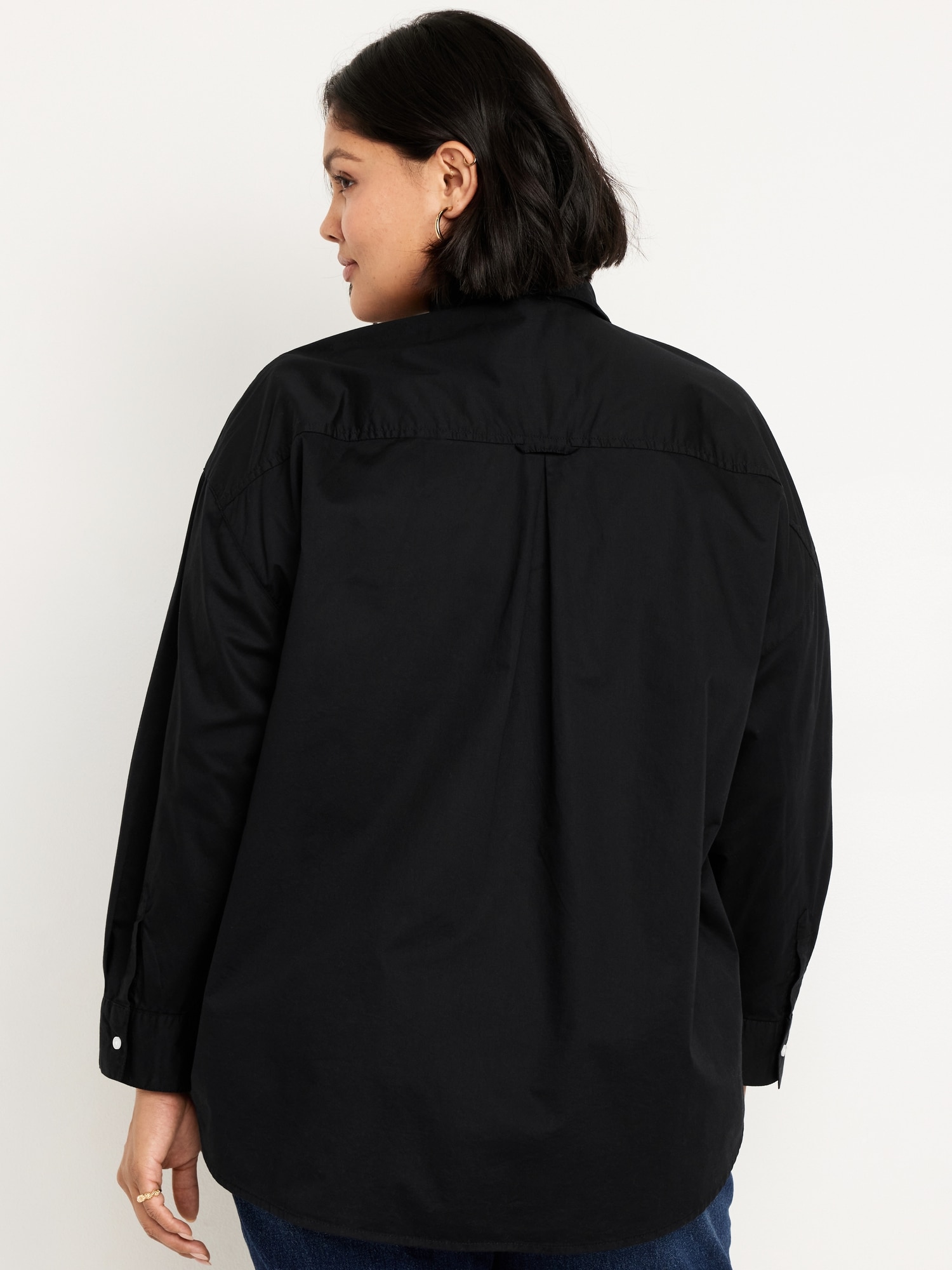 Oversized Button-Down Boyfriend Shirt: spread collar, long sleeves with buttoned cuffs, full-button front, patch chest pocket, curved hem, vertical stripes, #798437
