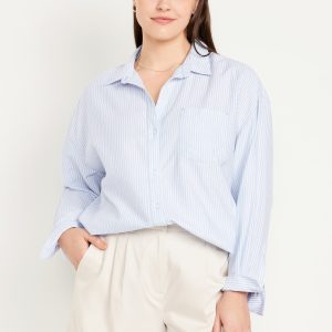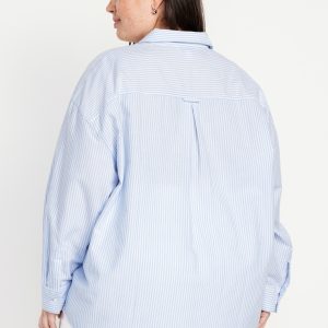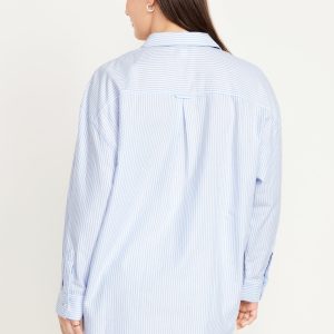 Oversized Button-Down Boyfriend Shirt: spread collar, long sleeves with buttoned cuffs, full-button front, patch chest pocket, curved hem, vertical stripes, #798437