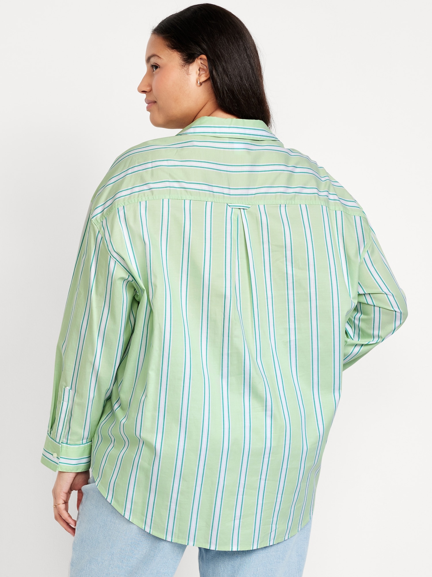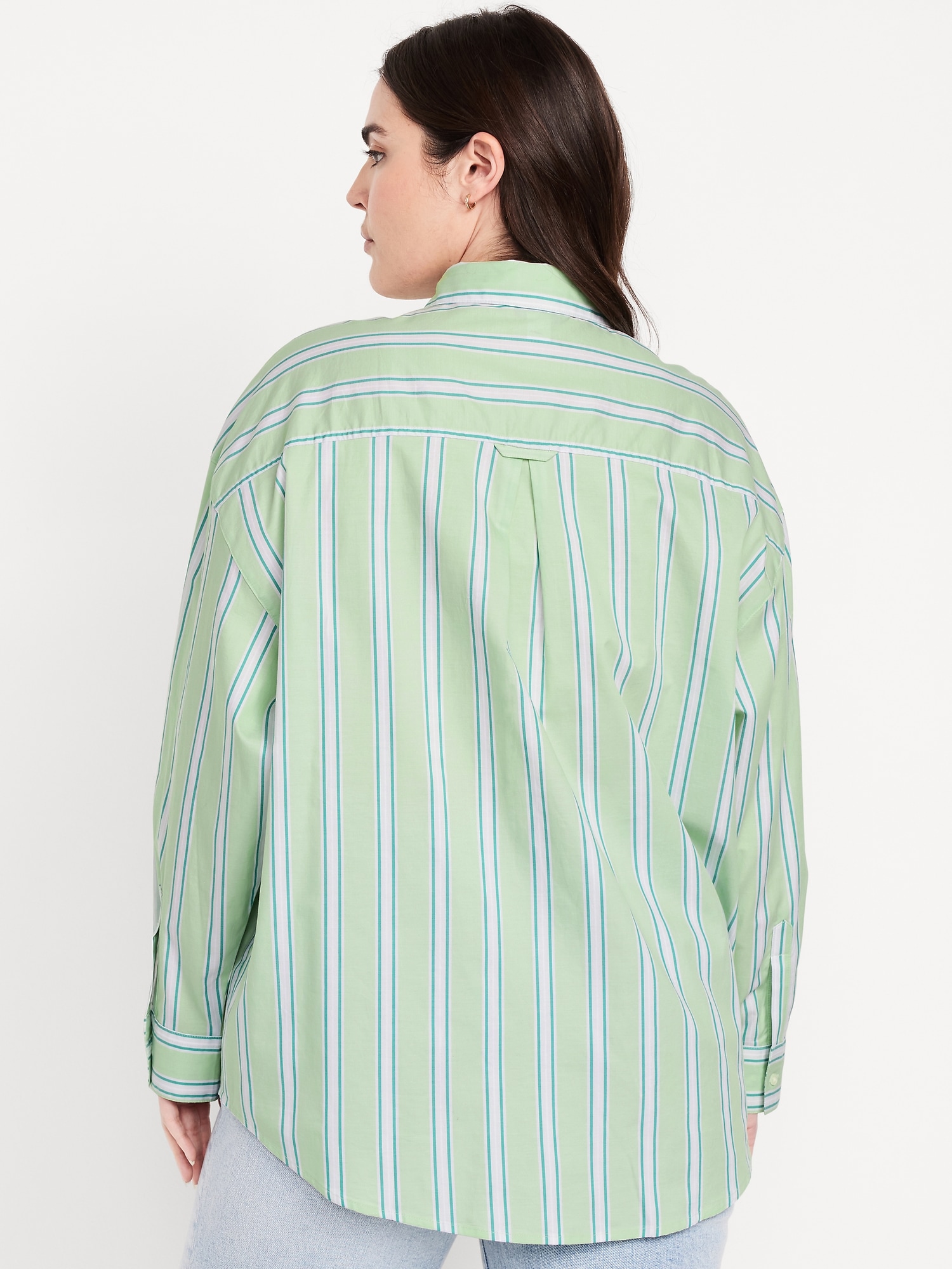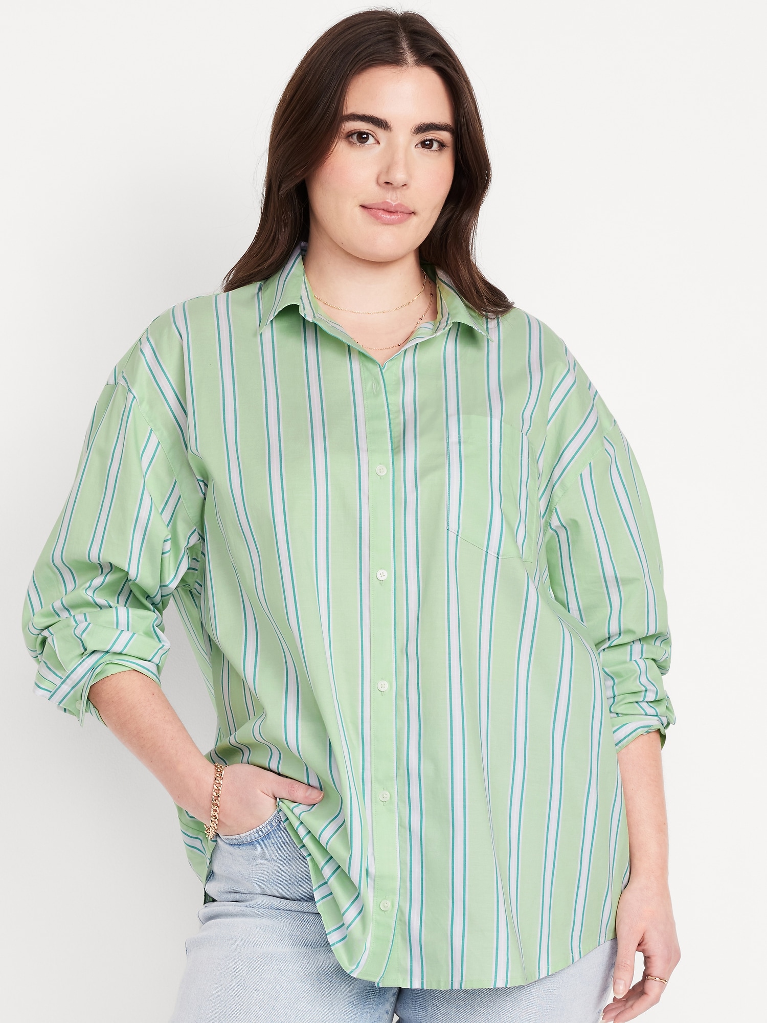 Oversized Button-Down Boyfriend Shirt: spread collar, long sleeves with buttoned cuffs, full-button front, patch chest pocket, curved hem, vertical stripes, #798437