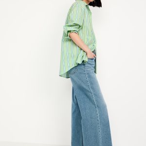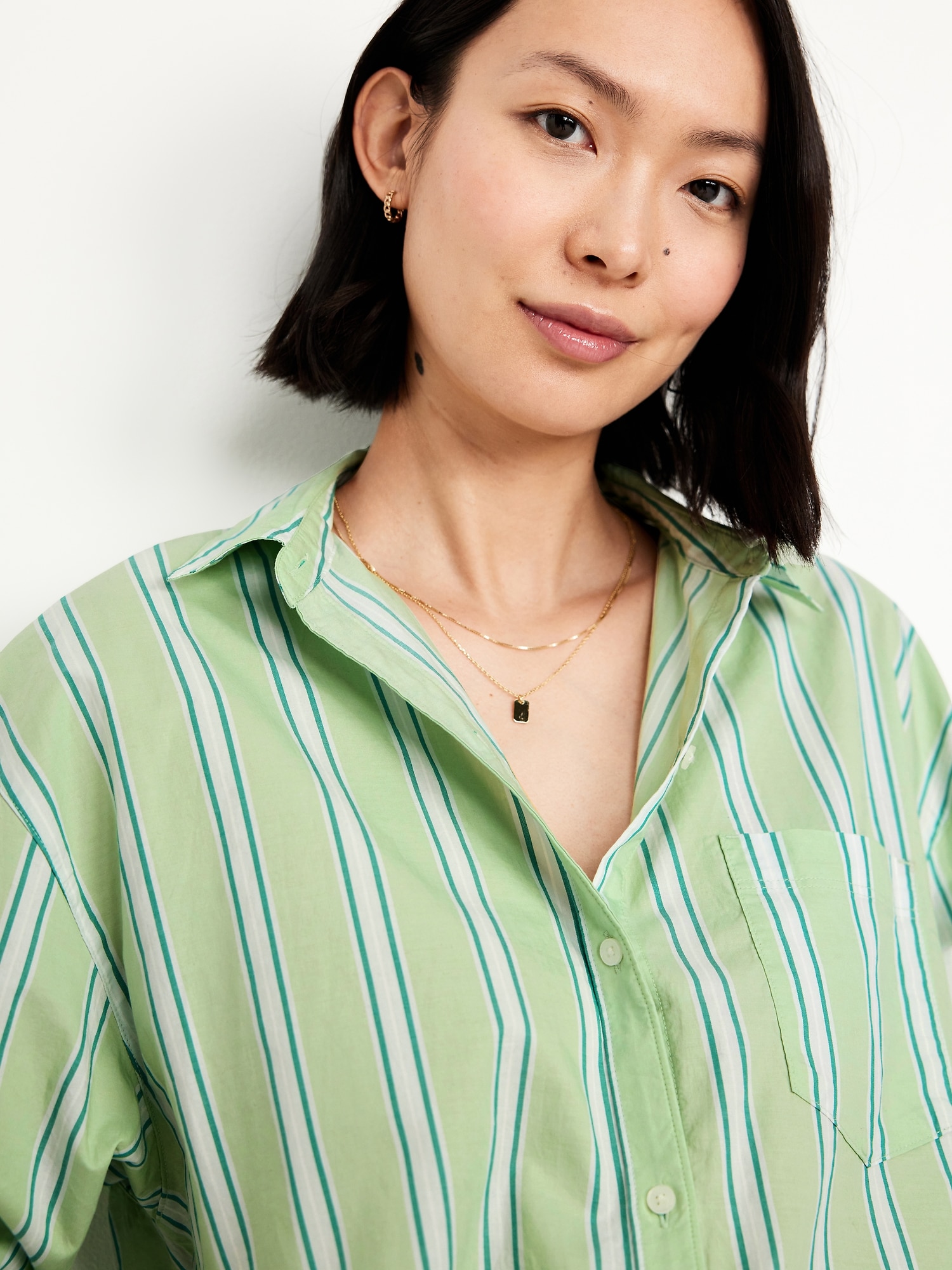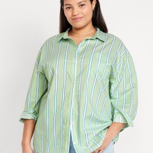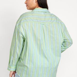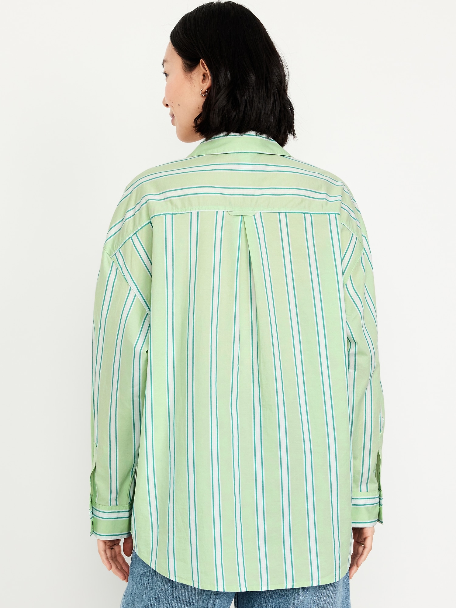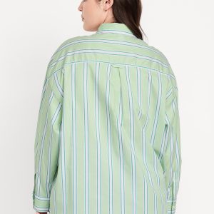 Oversized Button-Down Boyfriend Shirt: spread collar, long sleeves with buttoned cuffs, full-button front, patch chest pocket, curved hem, vertical stripes, #798437