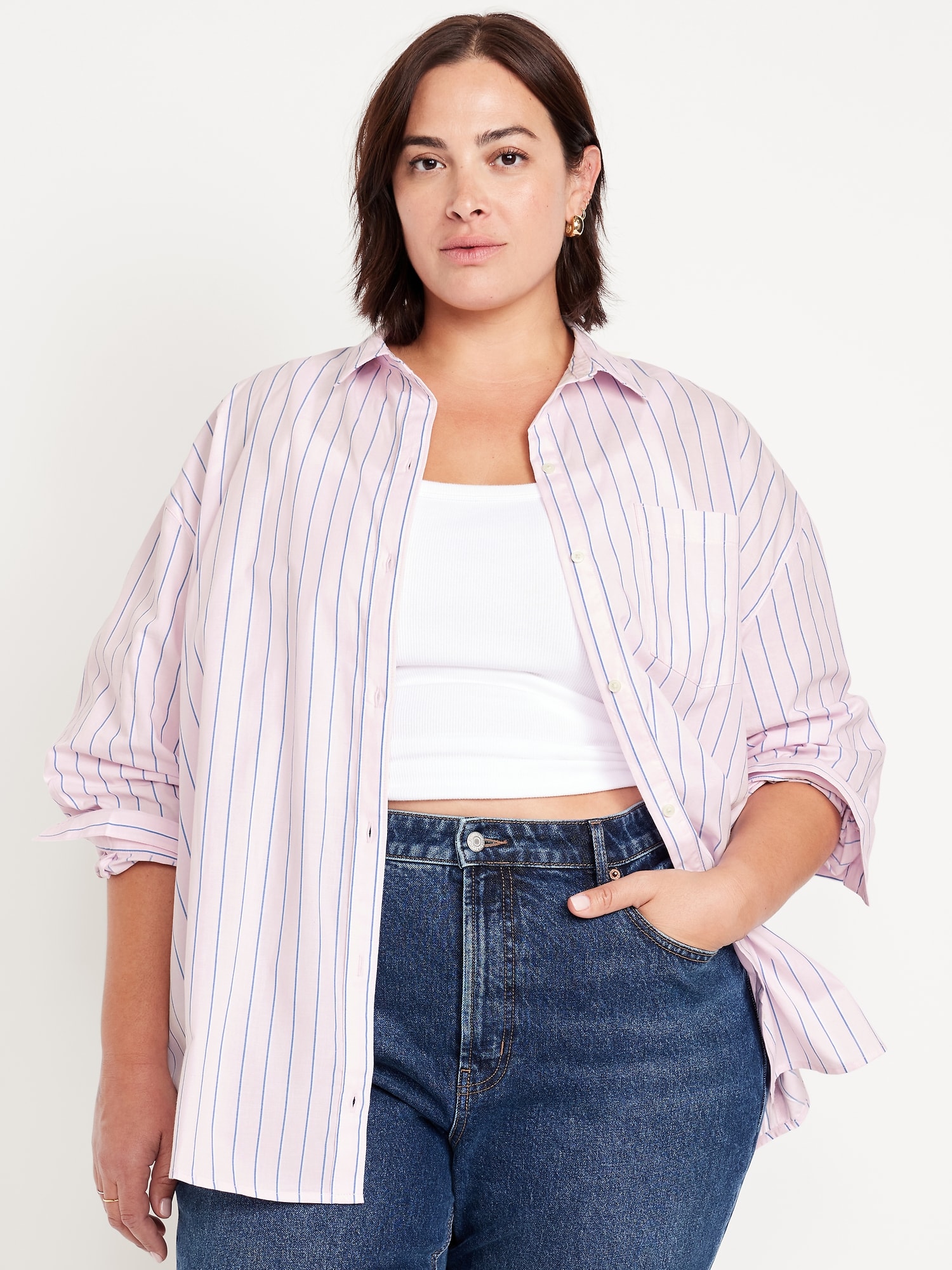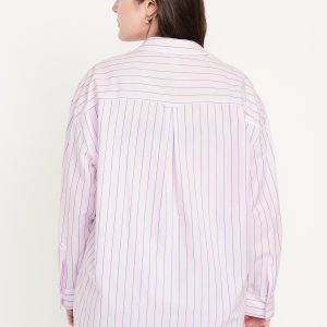 Oversized Button-Down Boyfriend Shirt: spread collar, long sleeves with buttoned cuffs, full-button front, patch chest pocket, curved hem, striped print, #844562