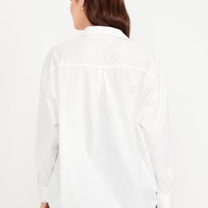 Oversized Button-Down Boyfriend Shirt: spread collar, long sleeves with buttoned cuffs, full-button front, patch chest pocket, curved hem, vertical stripes, #798437