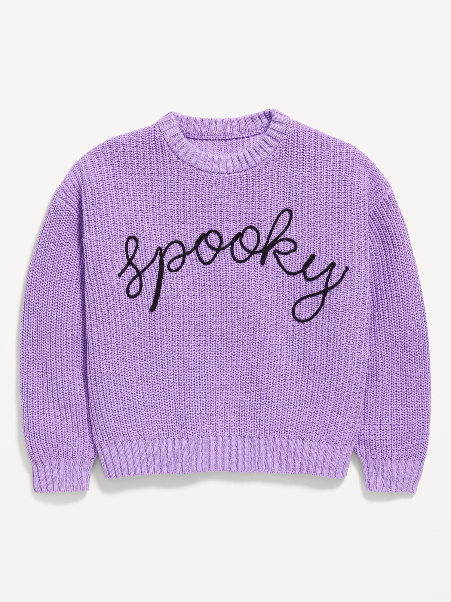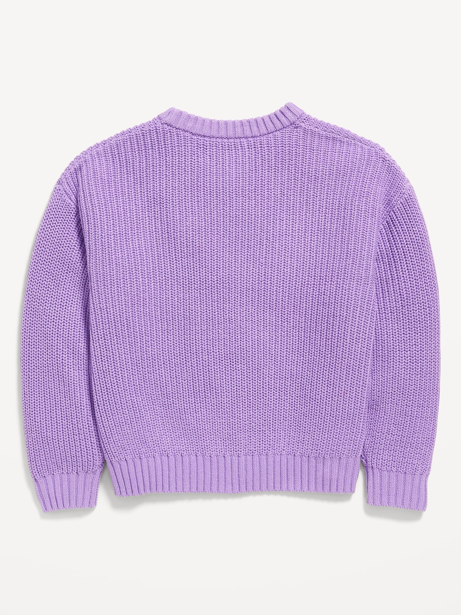 Oversized Crew-Neck Sweater for Girls: crew neck, long sleeves, drop shoulders, embroidery across front or all-over pattern, ribbed cuffs and hem, easy pullover style, #787577