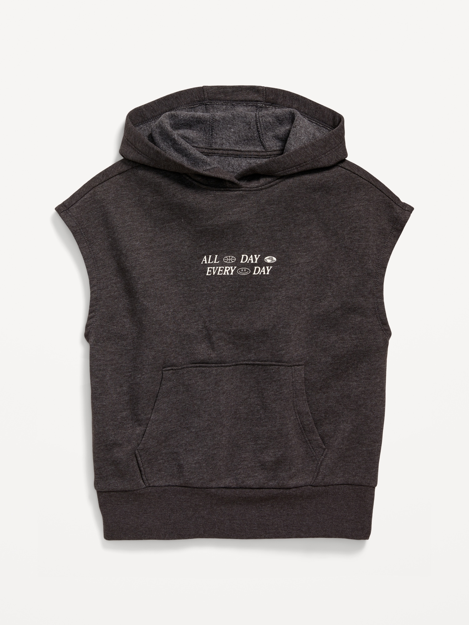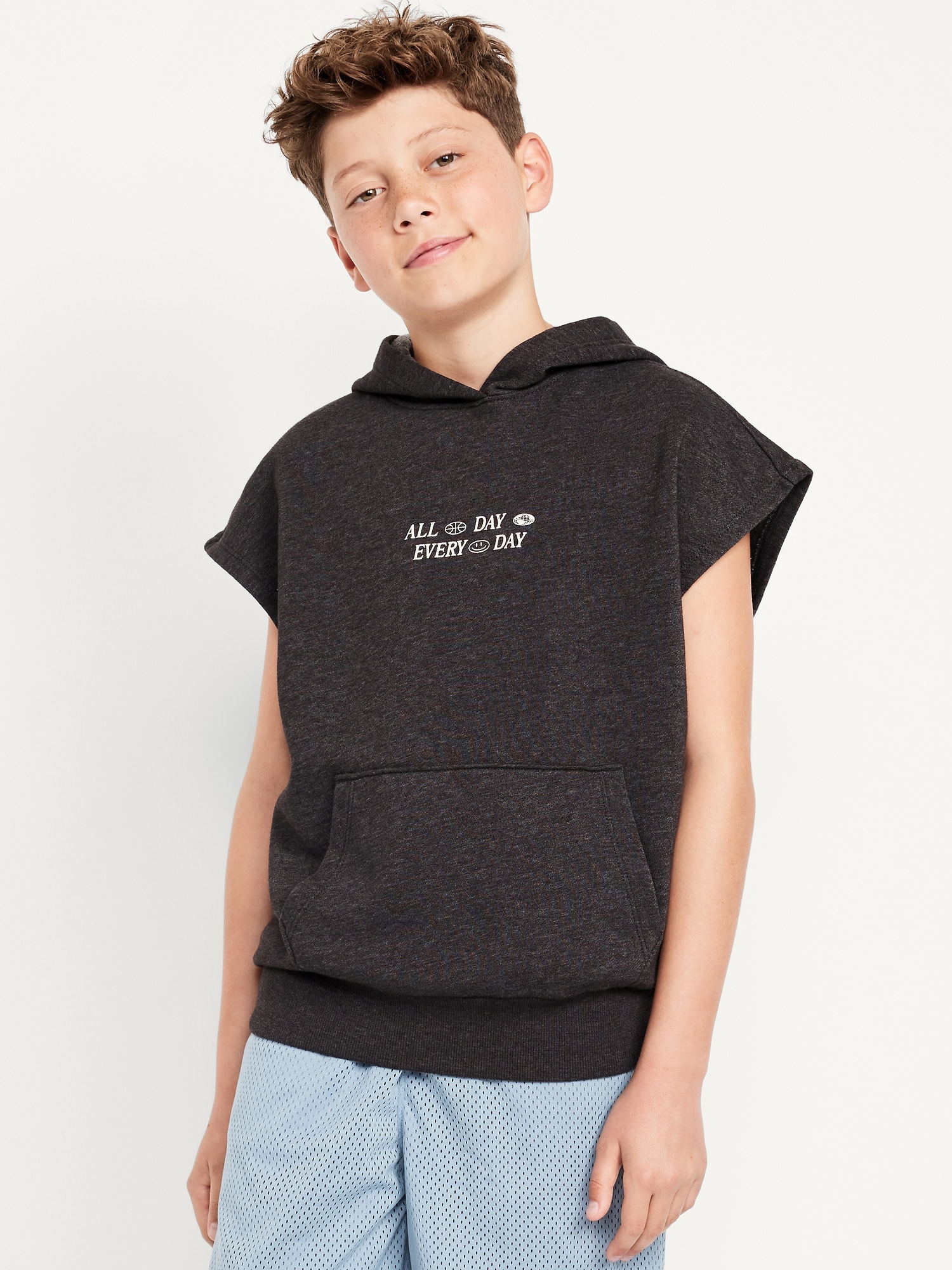 Oversized Fleece Graphic Muscle Hoodie for Boys: built-in hood, short cutoff sleeves, kangaroo pocket, banded hem, #761759