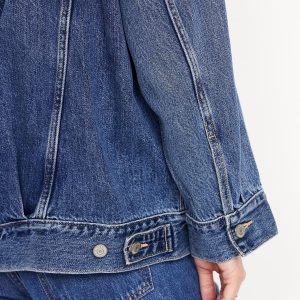 Oversized Jean Trucker Jacket: studded accents, spread collar, long sleeves with buttoned cuffs, full-button front, button-flap chest pockets, vertical welt pockets, #790495