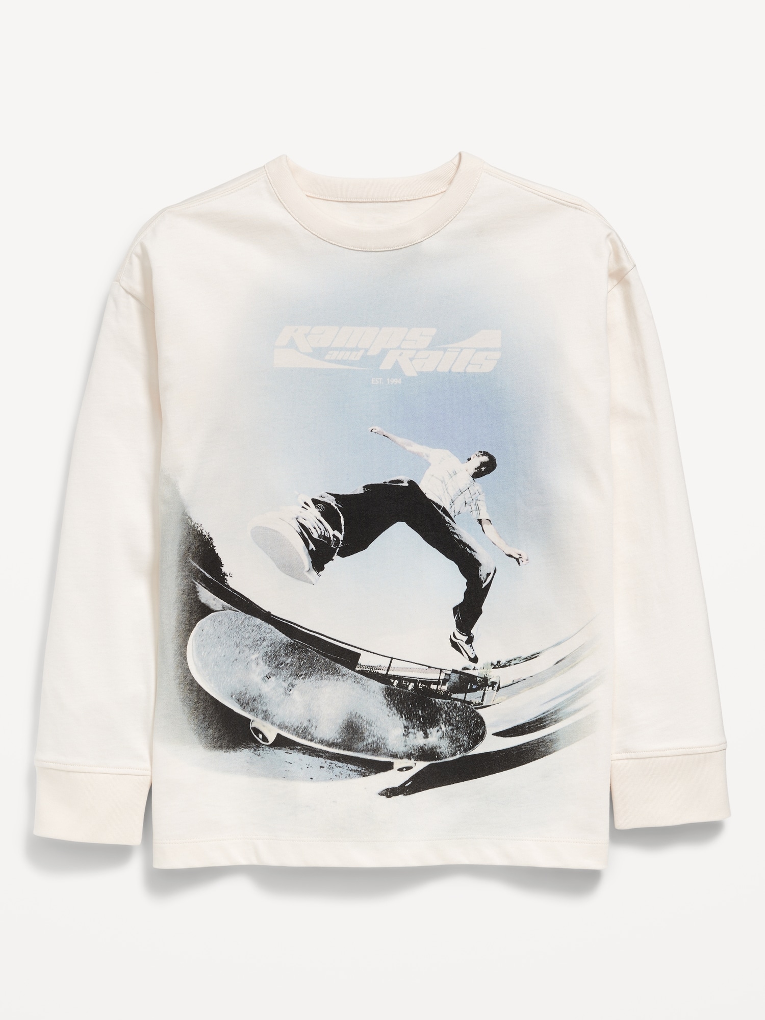 Oversized Long-Sleeve Graphic T-Shirt for Boys: crew neck, long sleeves, drop shoulders, graphic at front, #750309