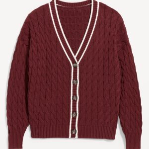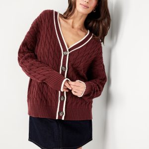 Oversized Slouchy Cable-Knit Cardigan Sweater: deep v-neck, long sleeves, button front, contrasting tipped trim, #784426