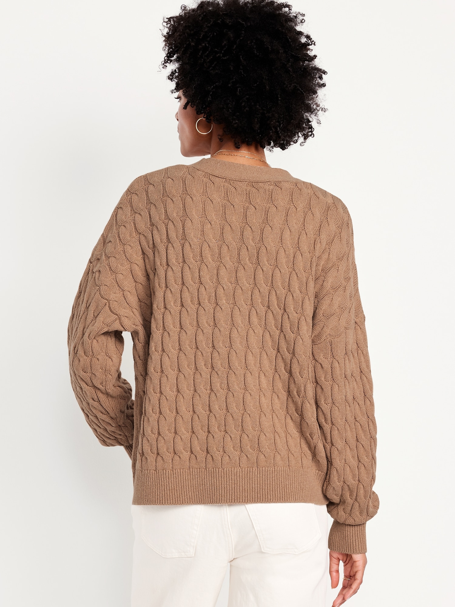 Oversized Slouchy Cable-Knit Cardigan Sweater: deep v-neck, long sleeves, button front, contrasting tipped trim, #784426