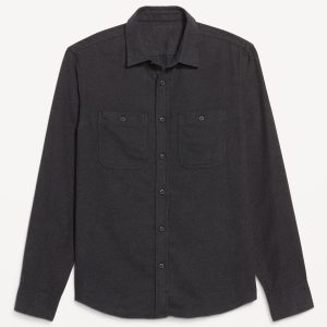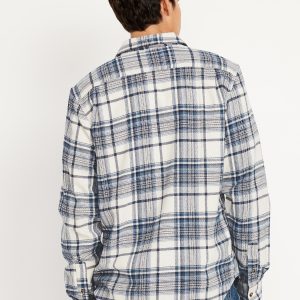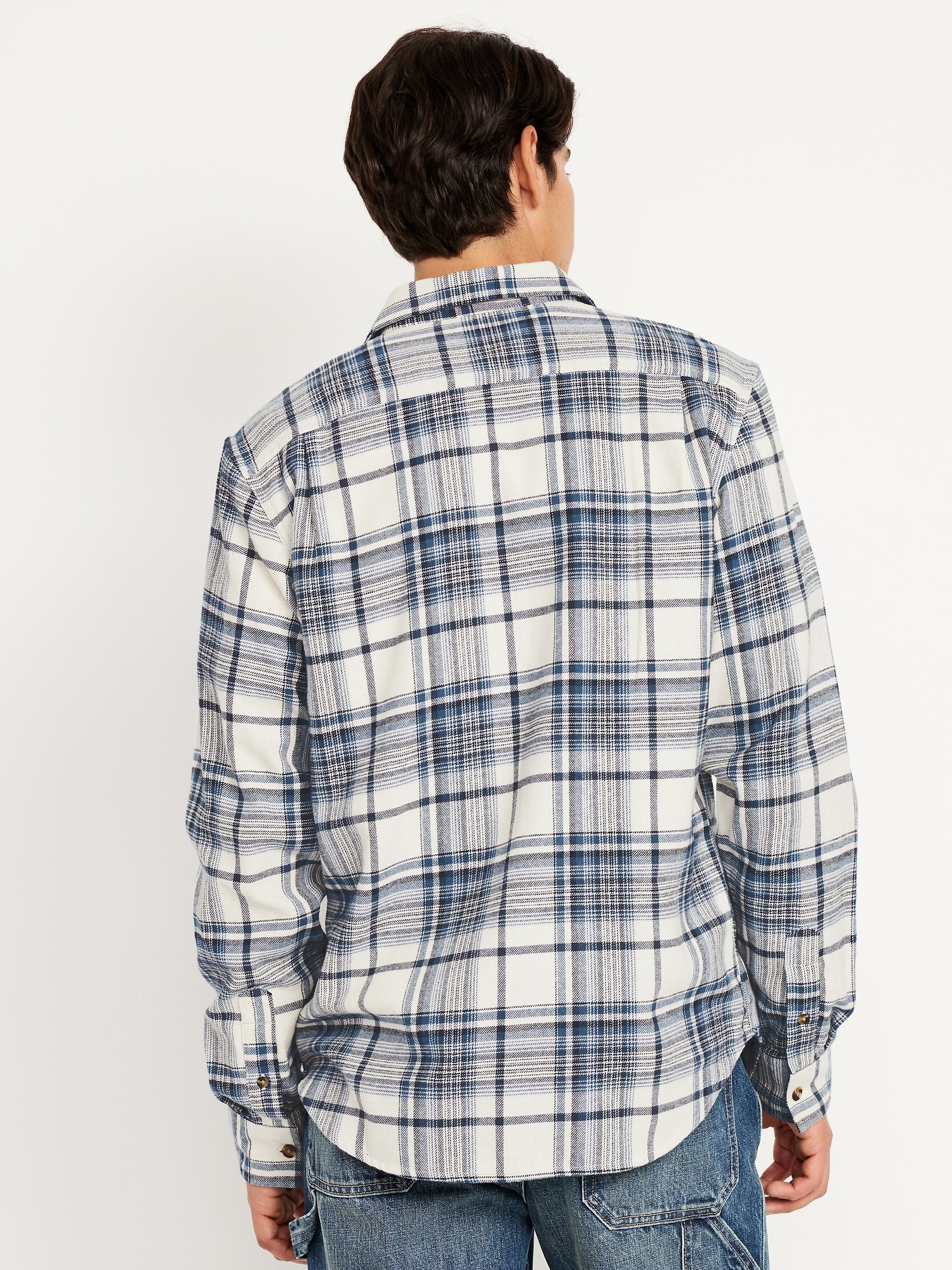 Plaid Flannel Pocket Shirt: spread collar, long sleeves with buttoned cuffs, button-patch chest pockets, full-button front, rounded hem, #801296