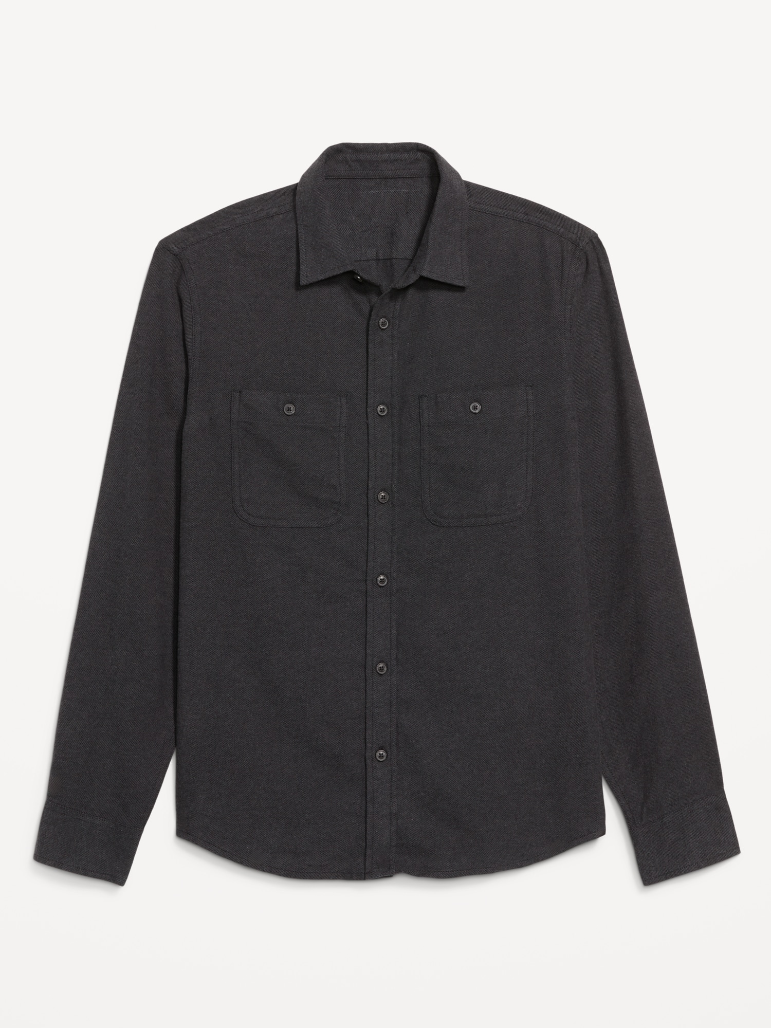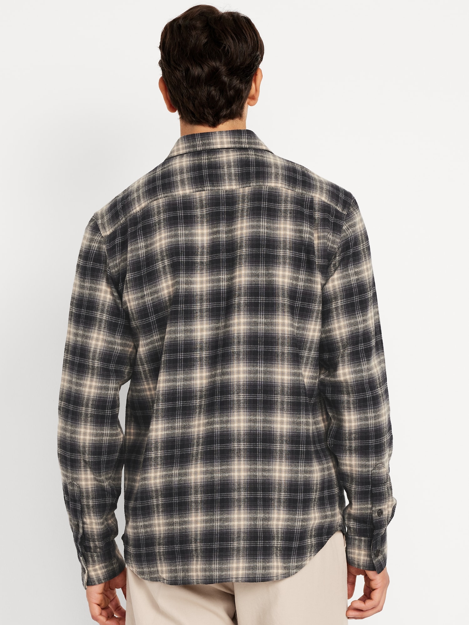 Plaid Flannel Pocket Shirt: spread collar, long sleeves with buttoned cuffs, button-patch chest pockets, full-button front, rounded hem, #801296