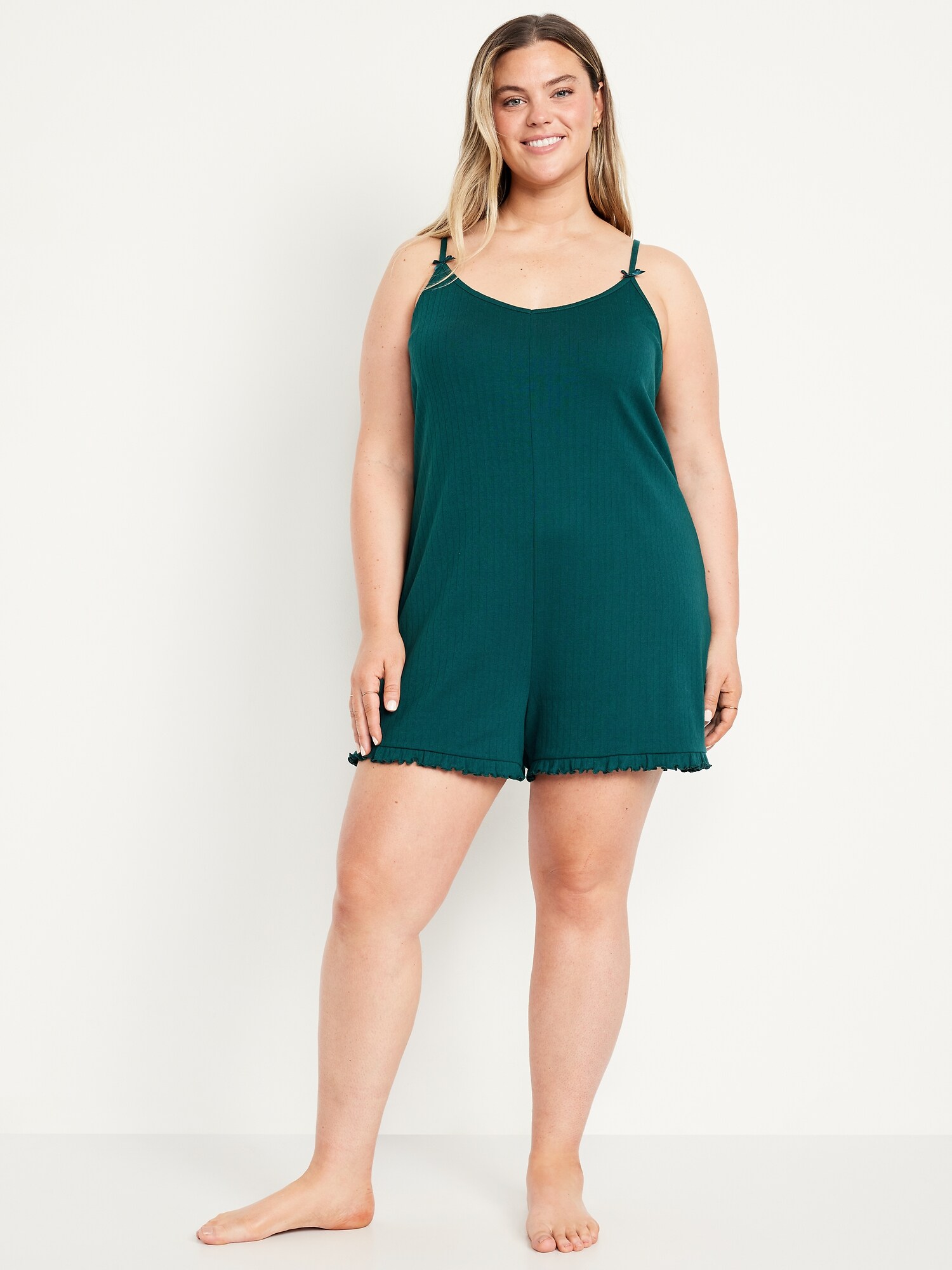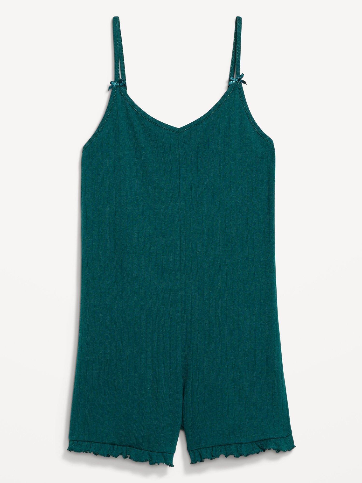 Pointelle Pajama Romper: spaghetti straps with bow accent, v-neck, ruffled hem, #808349