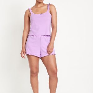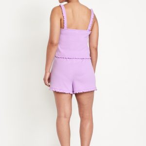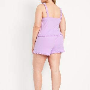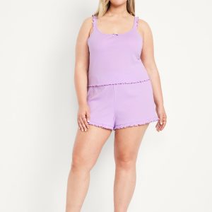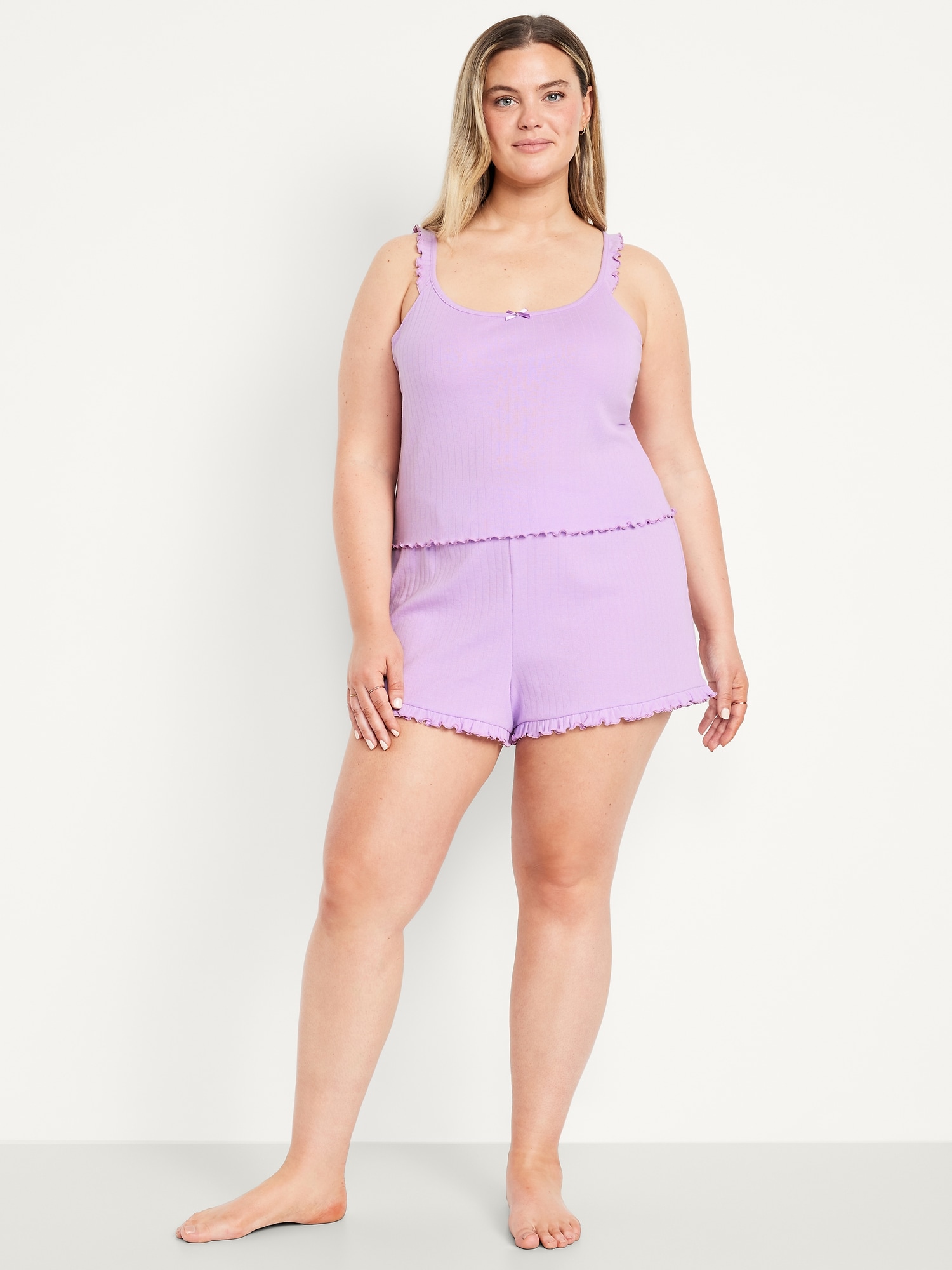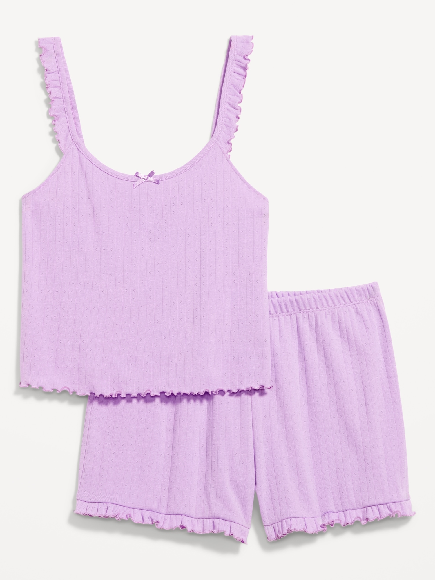 Pointelle Pajama Short Set: set includes cami sleep top and matching shorts, scoop neck with bow accent, ruffled straps, elastic-waist shorts with ruffled hem, #808329