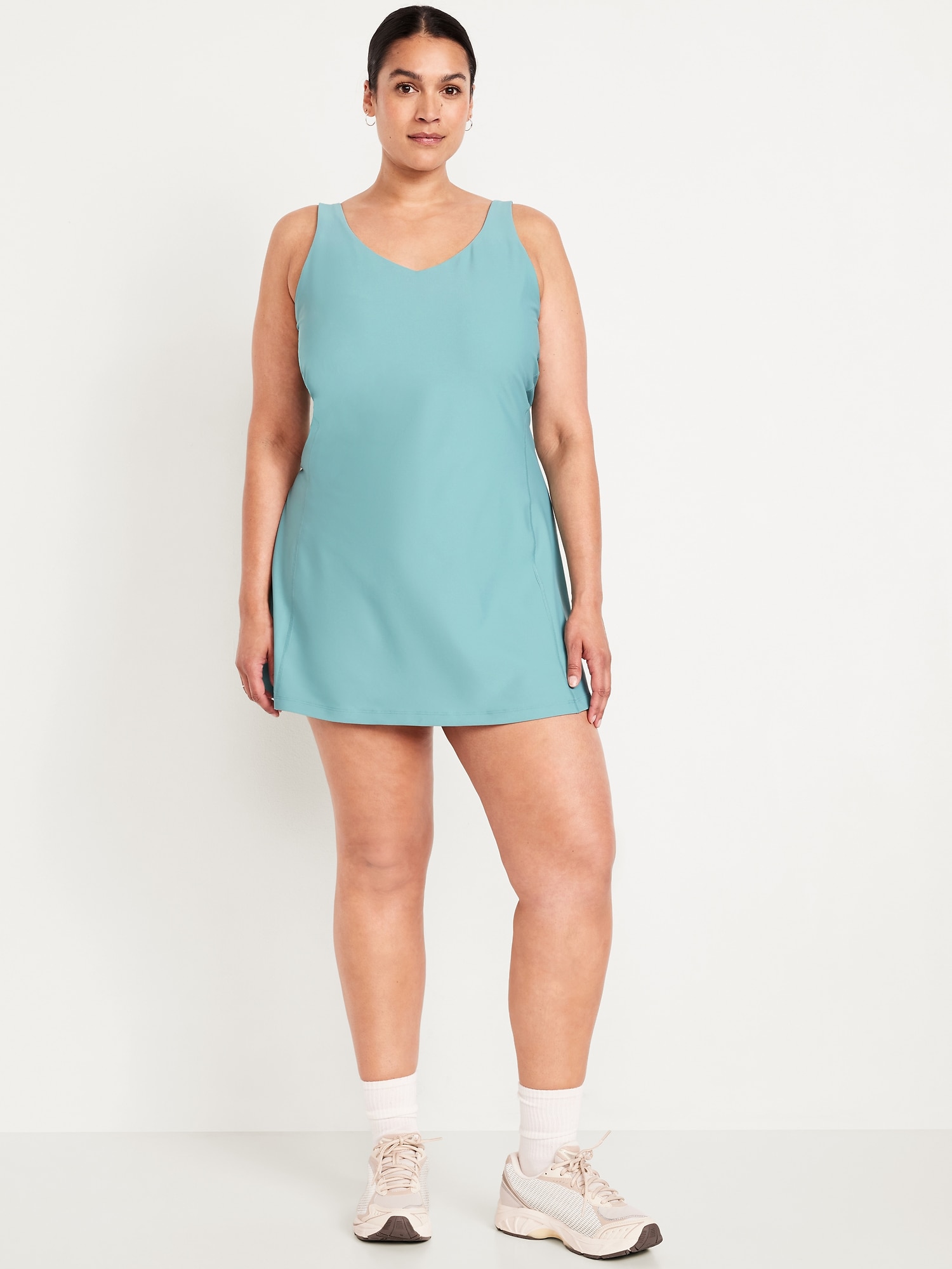 PowerSoft Athletic Dress: Featuring PowerSoft. Light compression meets a peachy-smooth, sweat-wicking fabric.v-neck, wide straps, shelf bra, go-dry wicks moisture, breathable, mini length, #662642