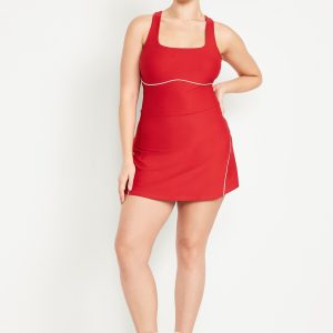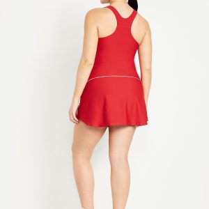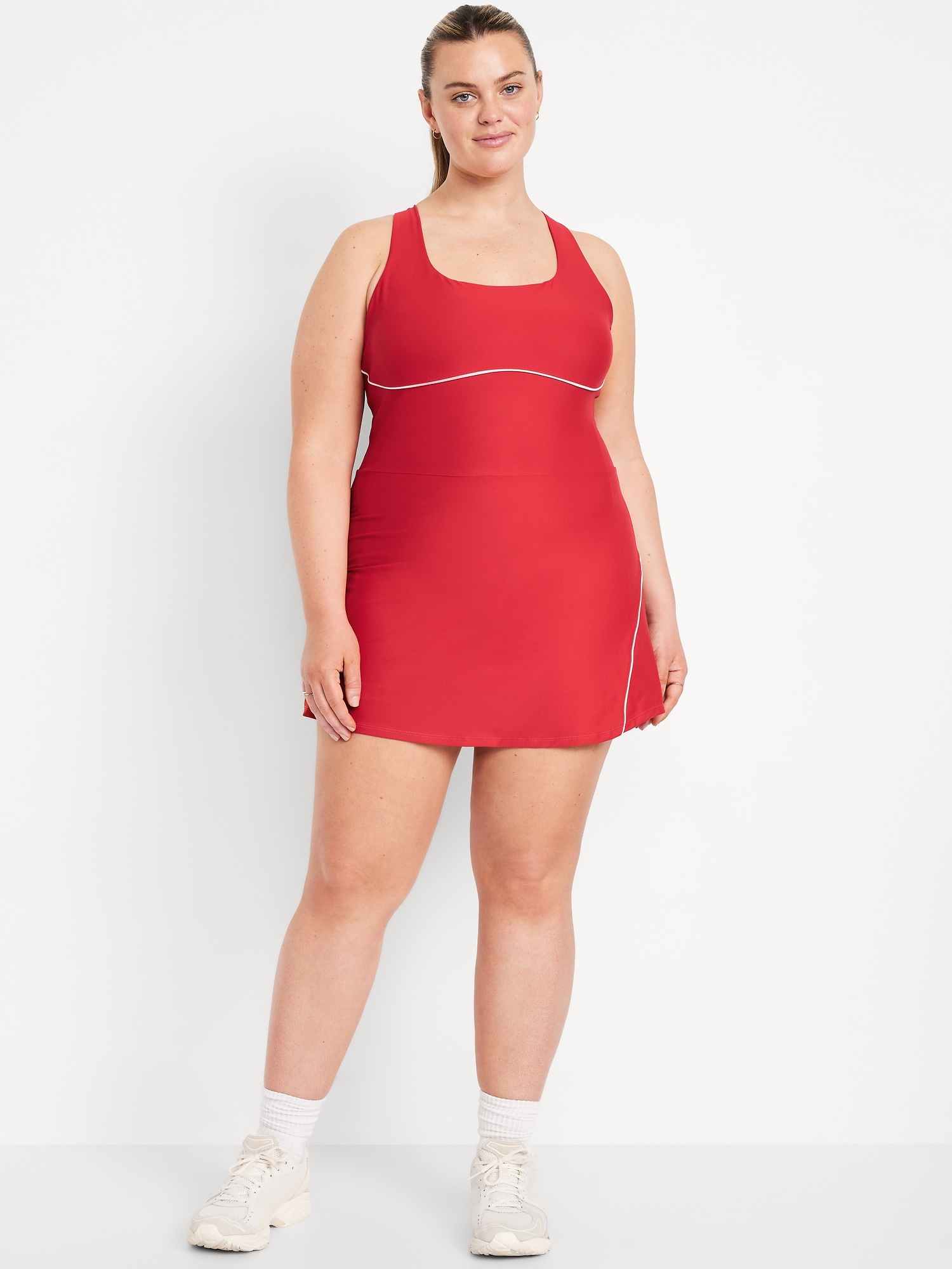 PowerSoft Athletic Dress: Featuring PowerSoft. Light compression meets a peachy-smooth, sweat-wicking fabric.straight neck, wide straps, racerback, shelf bra with removable cups, contrasting piping, mini length, go-dry wicks moisture, #749126