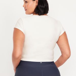 PowerSoft Support Crop Top: Featuring PowerSoft. Light compression meets a peachy-smooth, sweat-wicking fabric.crew neck, cap sleeves, removable pads, go-dry wicks moisture, #484464