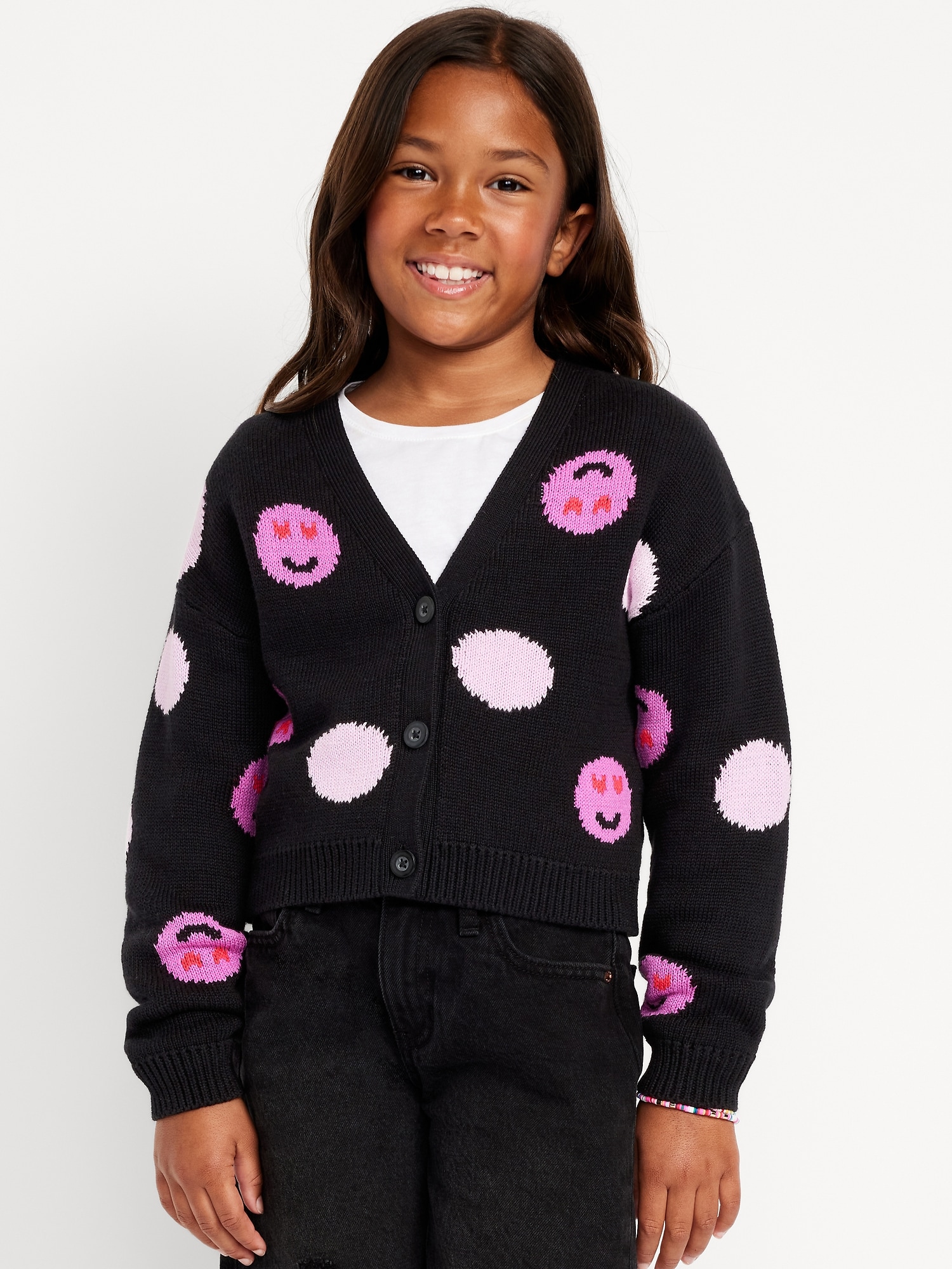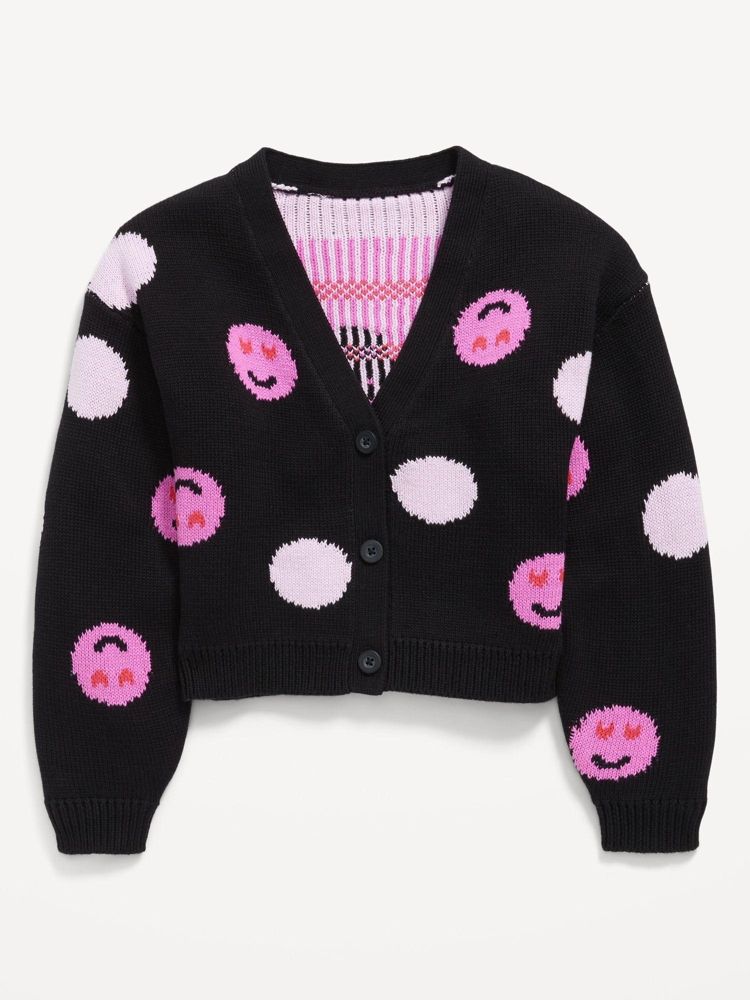 Printed Button-Front Cardigan Sweater for Girls: v neck, long sleeves, drop shoulders, buttoned placket, ribbed hem, all-over print, #766958