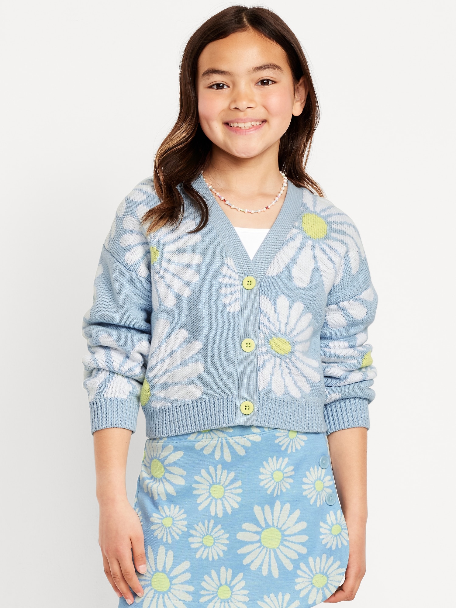 Printed Button-Front Cardigan Sweater for Girls: v neck, long sleeves, drop shoulders, buttoned placket, ribbed hem, all-over print, #766958
