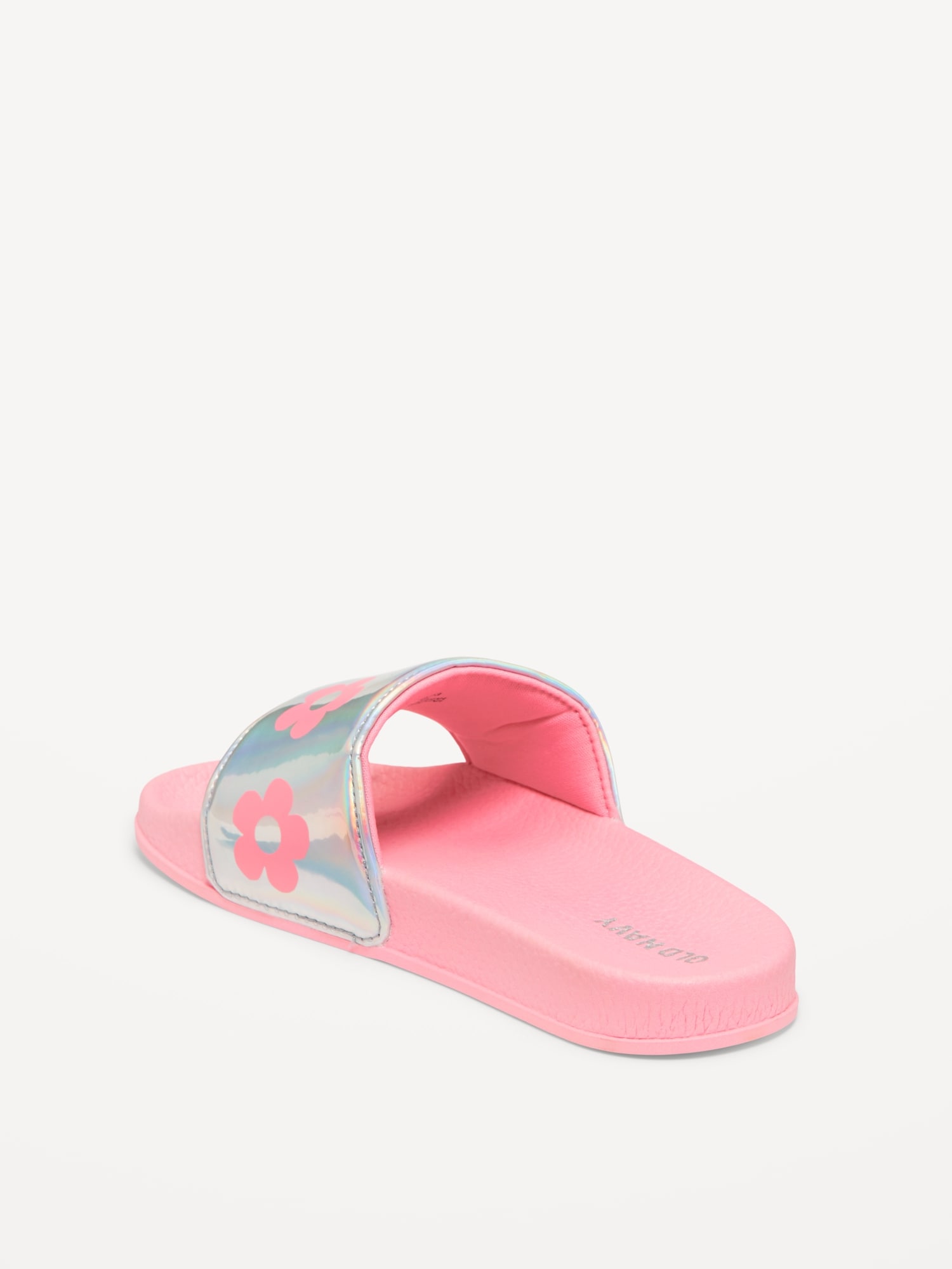 Printed Faux-Leather Pool Slide Sandals for Girls: wide-strap, contoured faux-leather foot bed, all-over print at strap, textured outsole, easy slide-on style, #693391