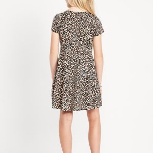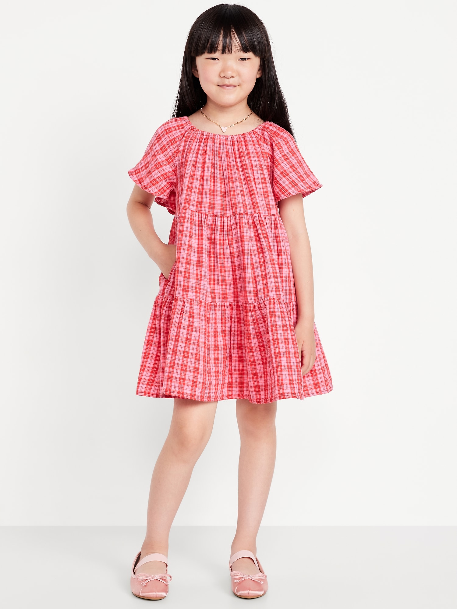 Printed Flutter-Sleeve Double-Weave Tiered Swing Dress for Girls: square cinched neckline, short flutter sleeves, tiered skirt, all-over print, #806067