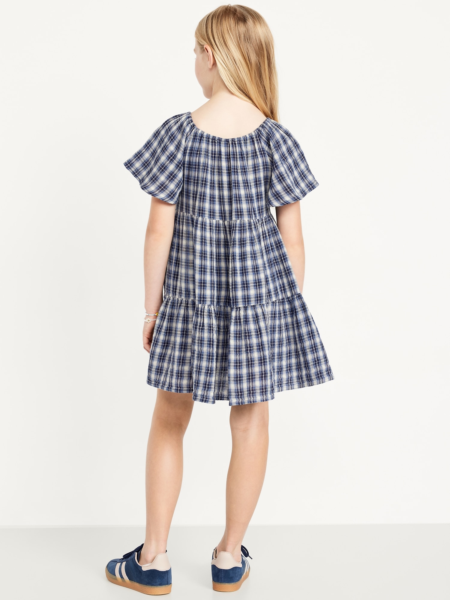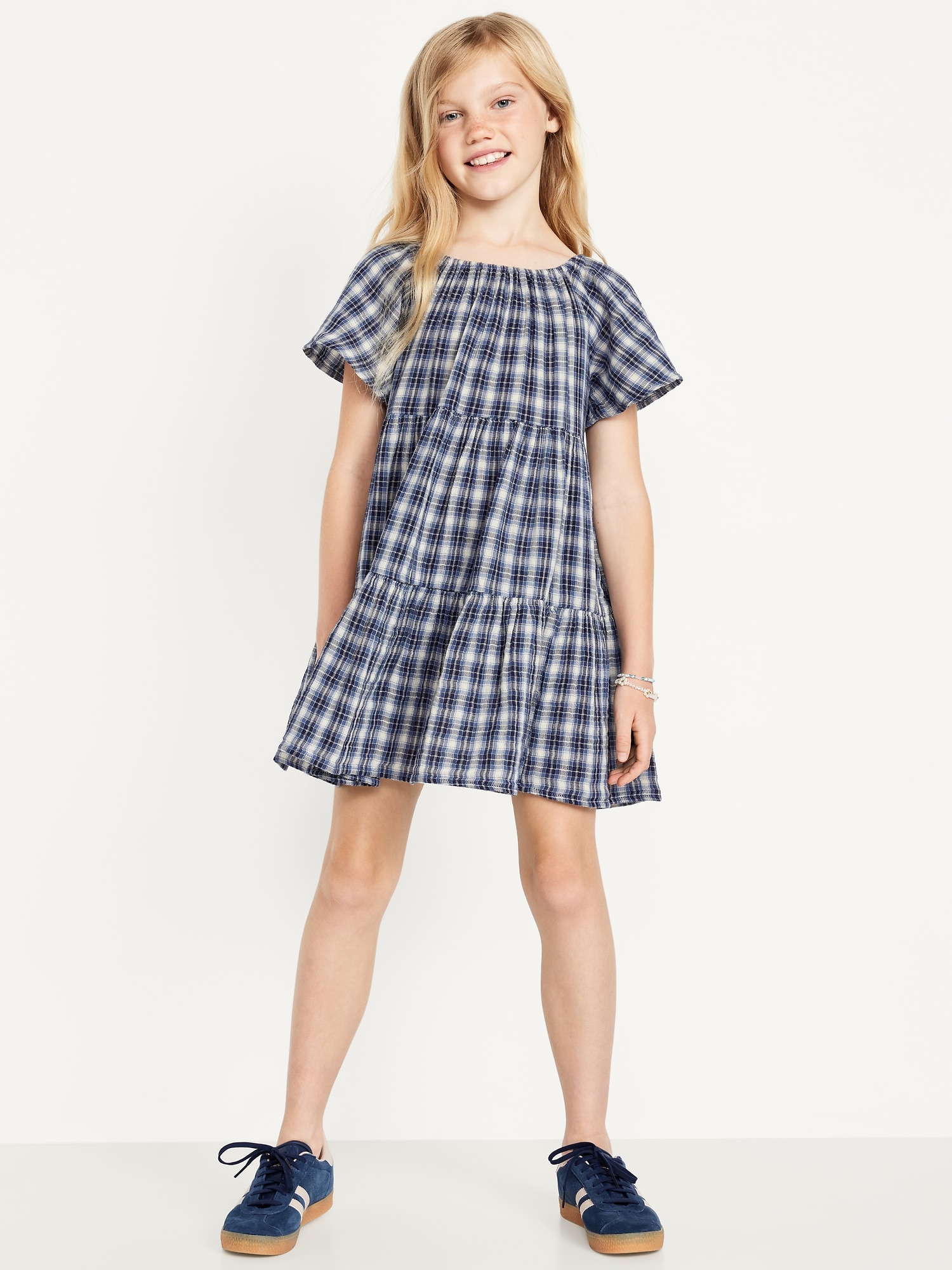 Printed Flutter-Sleeve Double-Weave Tiered Swing Dress for Girls: square cinched neckline, short flutter sleeves, tiered skirt, all-over print, #806067