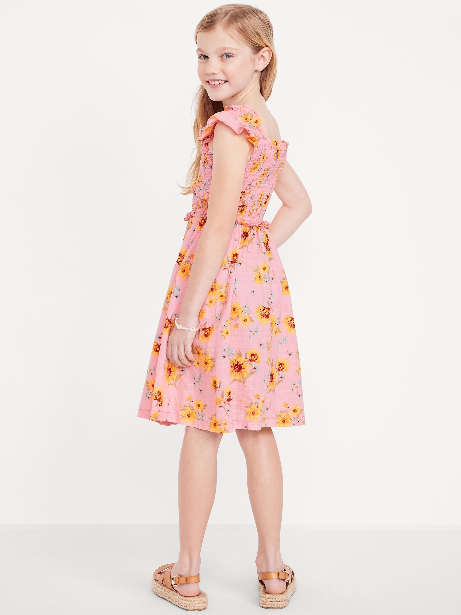 Printed Flutter-Sleeve Smocked Fit and Flare Dress for Girls: heart-shaped neckline, flutter sleeves, smocked bodice, ruffle trim along bodice and waist, full skirt, on-seam pockets, all-over print, #691063