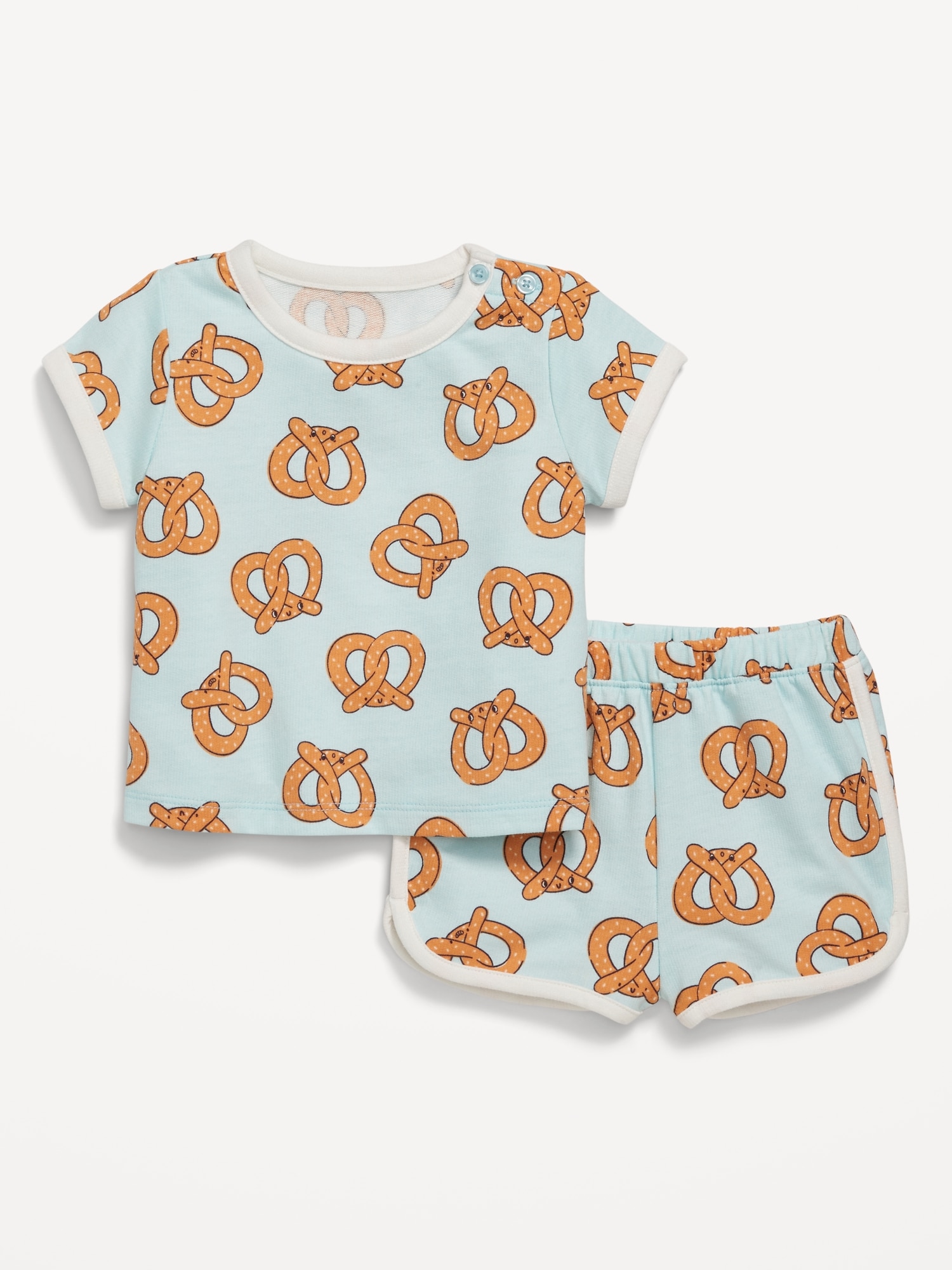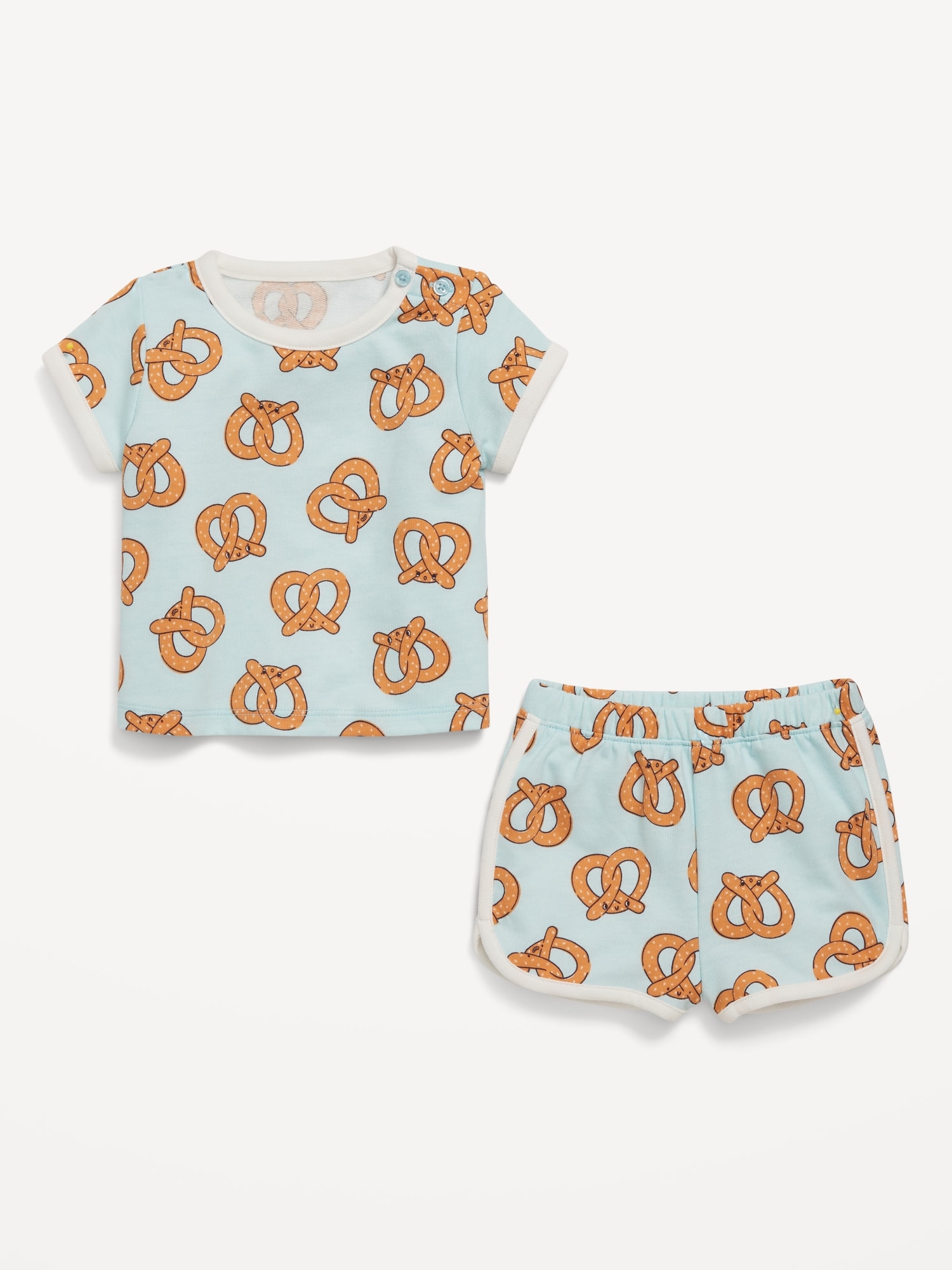 Printed French-Terry Ringer T-Shirt and Shorts Set for Baby: crew neck with buttons at shoulder, dolman sleeves, front graphic, functional elastic-drawstring waist shorts, available exclusively online and at old navy outlets, #766737